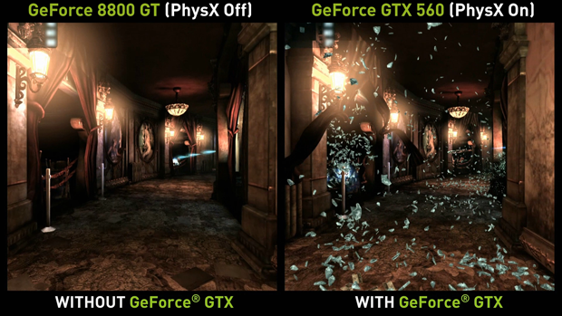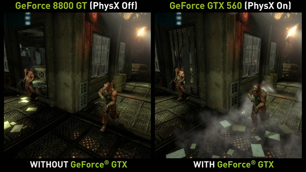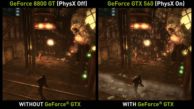 At 41 seconds in, you'll see a "fully functional steel mill" which without GeForce GTX has only canned animations. With GeForce GTX activated, your CUDA Cores create hundreds of shiny particles that not only bounce off surfaces all around, they bounce off yours and the computer's characters as well.