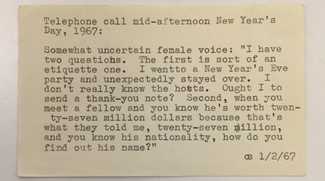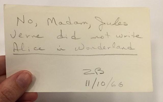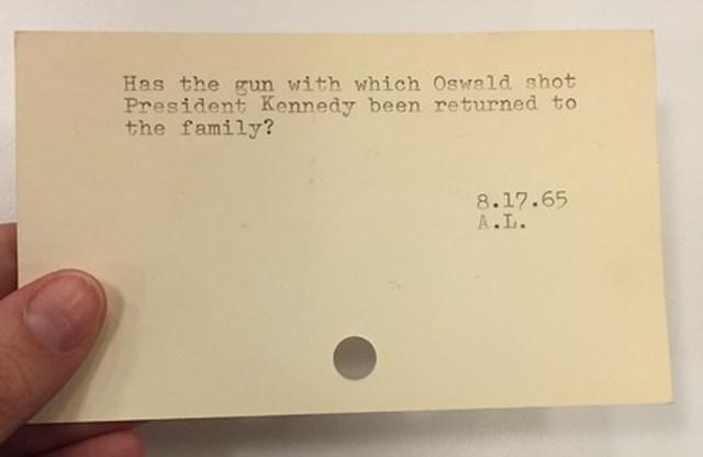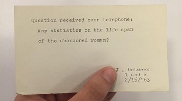The New York Public Library has surfaced a box full of reference questions typed on cards, each of them dated and some containing names. You can see one example below, and a couple more in the gallery farther down.
