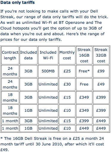 O2 UK have officially confirmed pricing for the Dell Streak Android MID, which will arrive on their network tomorrow in both 16GB and 32GB flavors. As with The Carphone Warehouse, the Streak will be available from free with a new £25/month agreement; however, that's if you're taking out an O2 data-only plan. If you want voice service, meanwhile, you'll be looking at £35/month minimum if you want a "free" Streak.Full tariff details after the cut