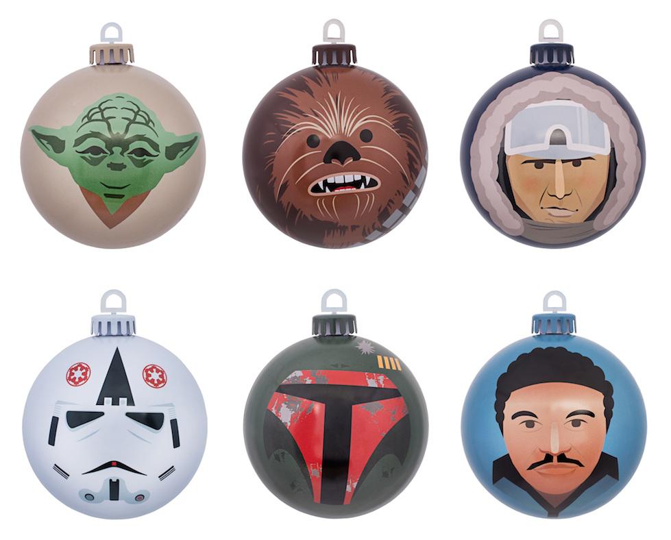 First up is the A New Hope set, which has ornaments for R2-D2, C-3P0, Obi-Wan, Darth Vader, Luke Skywaler, and Princess Leia. The Empire Strikes Back set has Yoda, Chewbacca, Han Solo, a Snow Trooper, Boba Fett, and Lando.