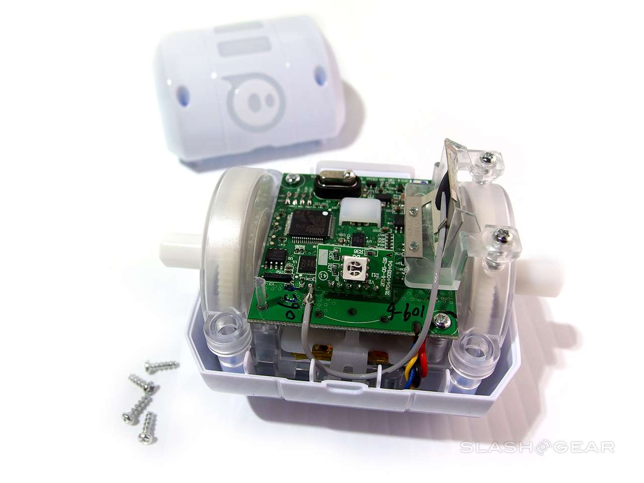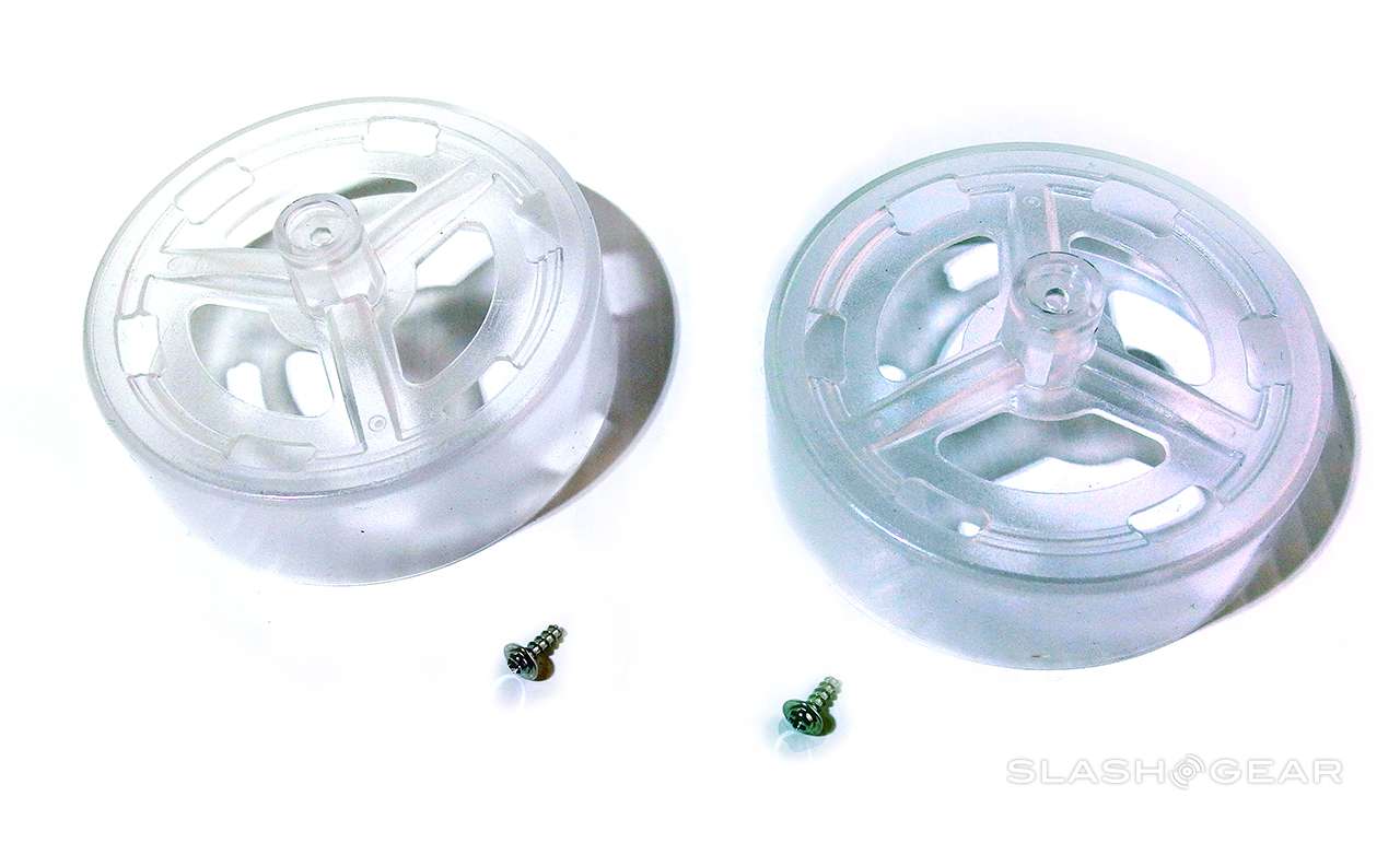The device is being released in white (like you see here) and black. Most of the outer bits are made of a flexible, tough polycarbonate for rough drops and tumbles. You'll be attaching hubcaps if you wish (one set included in the box), as well as a variety of rubbery tires (one set included in the box).