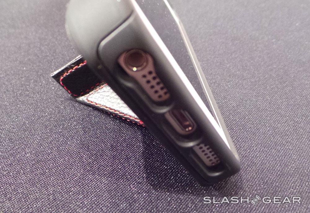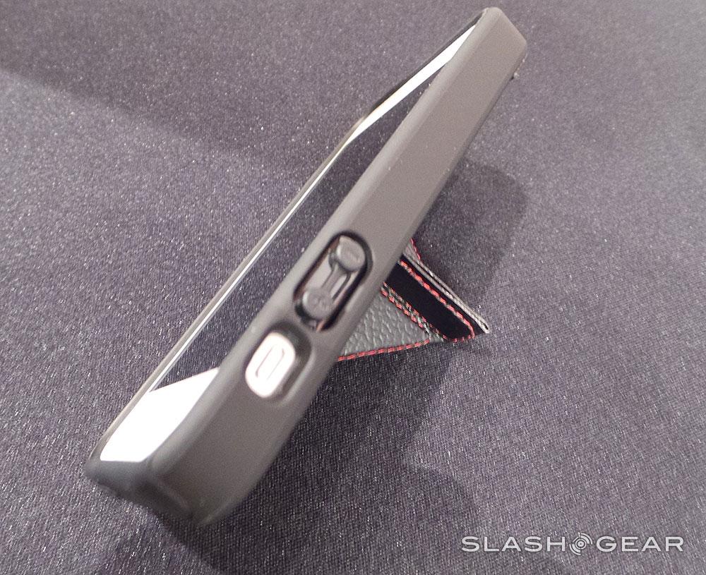 The iPhone 5 unit we're seeing here is shown in leathery black with red stitching, working as two separate pieces, a case that can exist on its own, and the leathery bit that fits over it to create one single unit. The protection this unit offers is thick and robust, but the real gem is the stand – it's magnetically held tight and down in your pocket when you don't need it and folds up and out when you do. Real simple, really high quality – and it'll hold your iPhone up in two different positions.