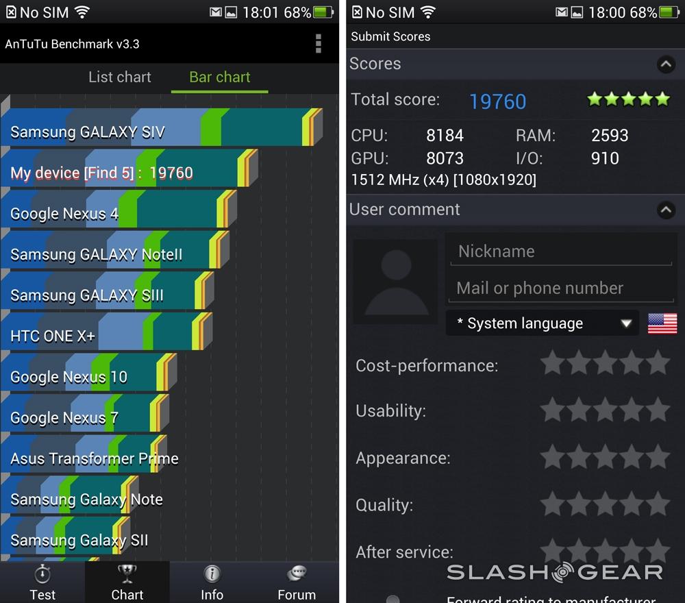 Below you'll also find some benchmark results from the OPPO Find 5 with its most up-to-date software. Again, this device isn't going to win any beastly smartphone battles, but it gets the job done. This device isn't going to be the best on the market if you're looking for a top-tier gaming experience, but for media consumption and capture and everyday non-game app activities, you'll be par for the course.