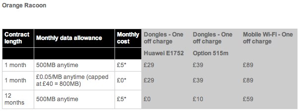 Meanwhile occasional mobile broadband users can choose between Orange's Racoon packages offer 500MB on one and 12 month plans, or a pay as you consume option with no line rental for existing Orange customers, who simply pay 5p for each megabyte of data.