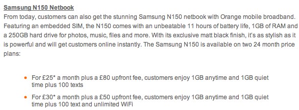 From today, customers can also get the stunning Samsung N150 netbook with Orange mobile broadband. Featuring an embedded SIM, the N150 comes with an unbeatable 11 hours of battery life, 1GB of RAM and a 250GB hard drive for photos, music, files and more. With its exclusive matt black finish, it's as stylish as it is powerful and will get customers online instantly. The Samsung N150 is available on two 24 month price plans: