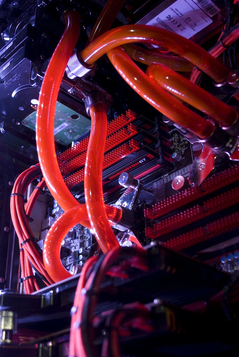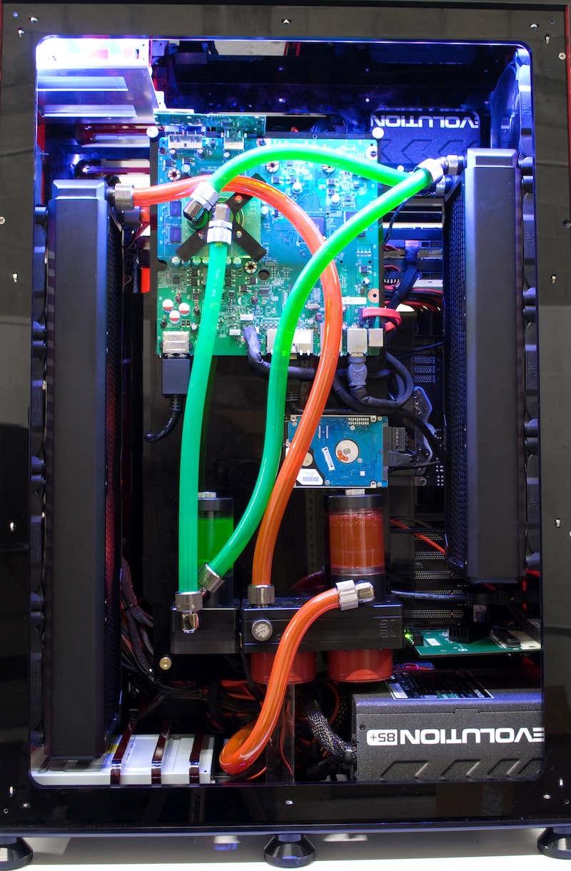 If you've $16,999, after all, you can upgrade to a dual-CPU Intel Xeon X5680 rig (each processor overclocked to 4.3GHz) with 12GB of memory and four SLI EVGA GTX 480 FTW video cards. Either way it's all liquid cooled, with LED lighting, fan controllers and a Blu-ray burner.