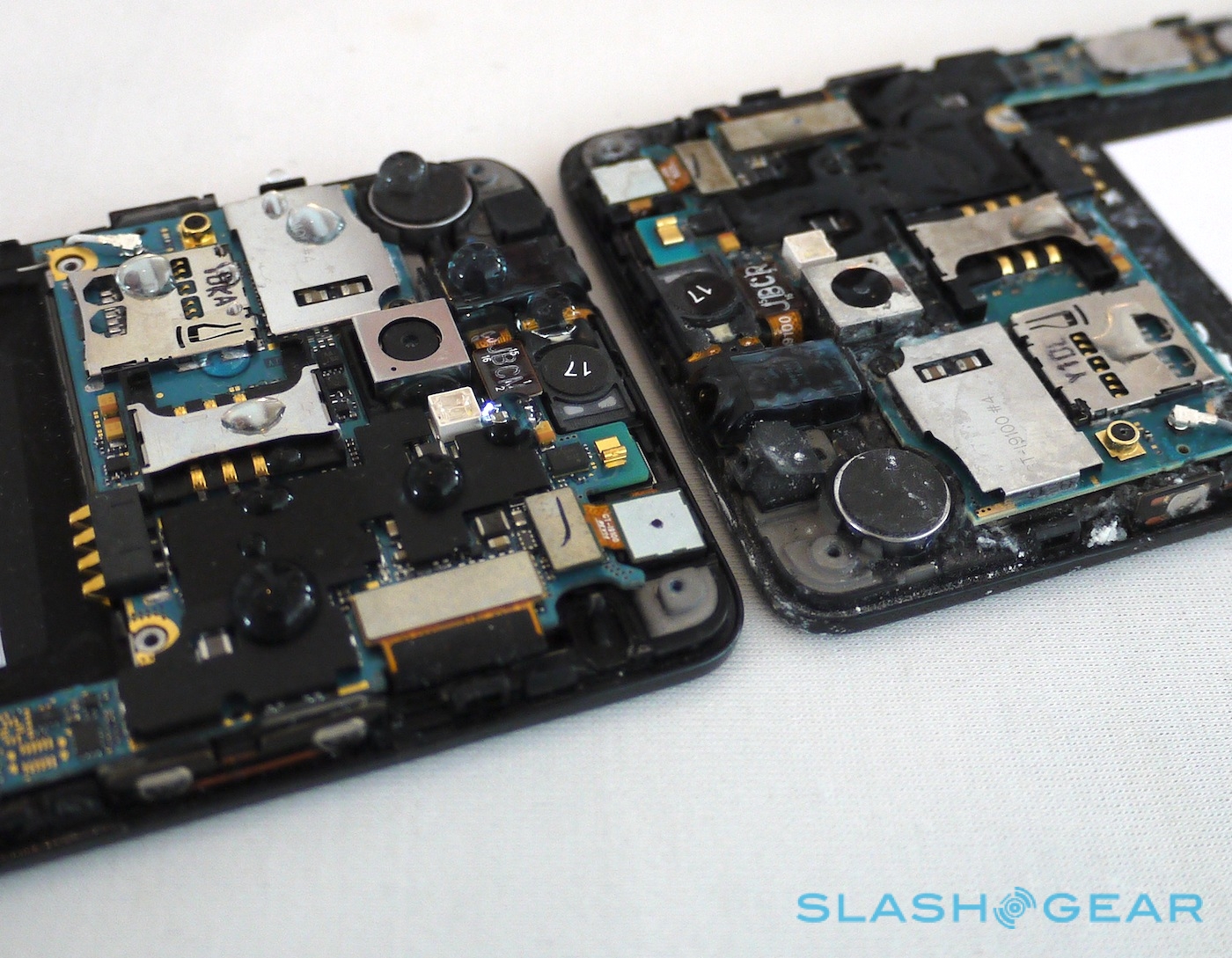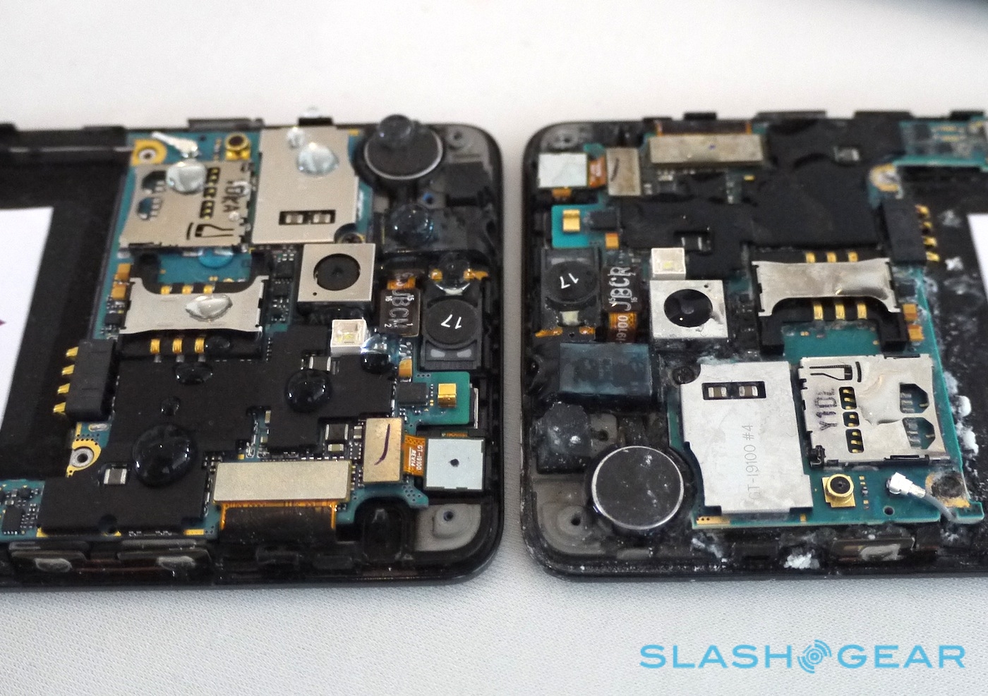 P2i had two Galaxy S II handsets to demo, one treated with Aridion and the other untreated. Drip water on the regular phone's circuits and it immediately spread out around them; after a while, that's what causes shorts, corrosion and, eventually, phones stopping working. On the Aridion-treated GSII, meanwhile, the droplets stayed as perfectly formed bubbles of liquid, easy to dab up with a cloth.