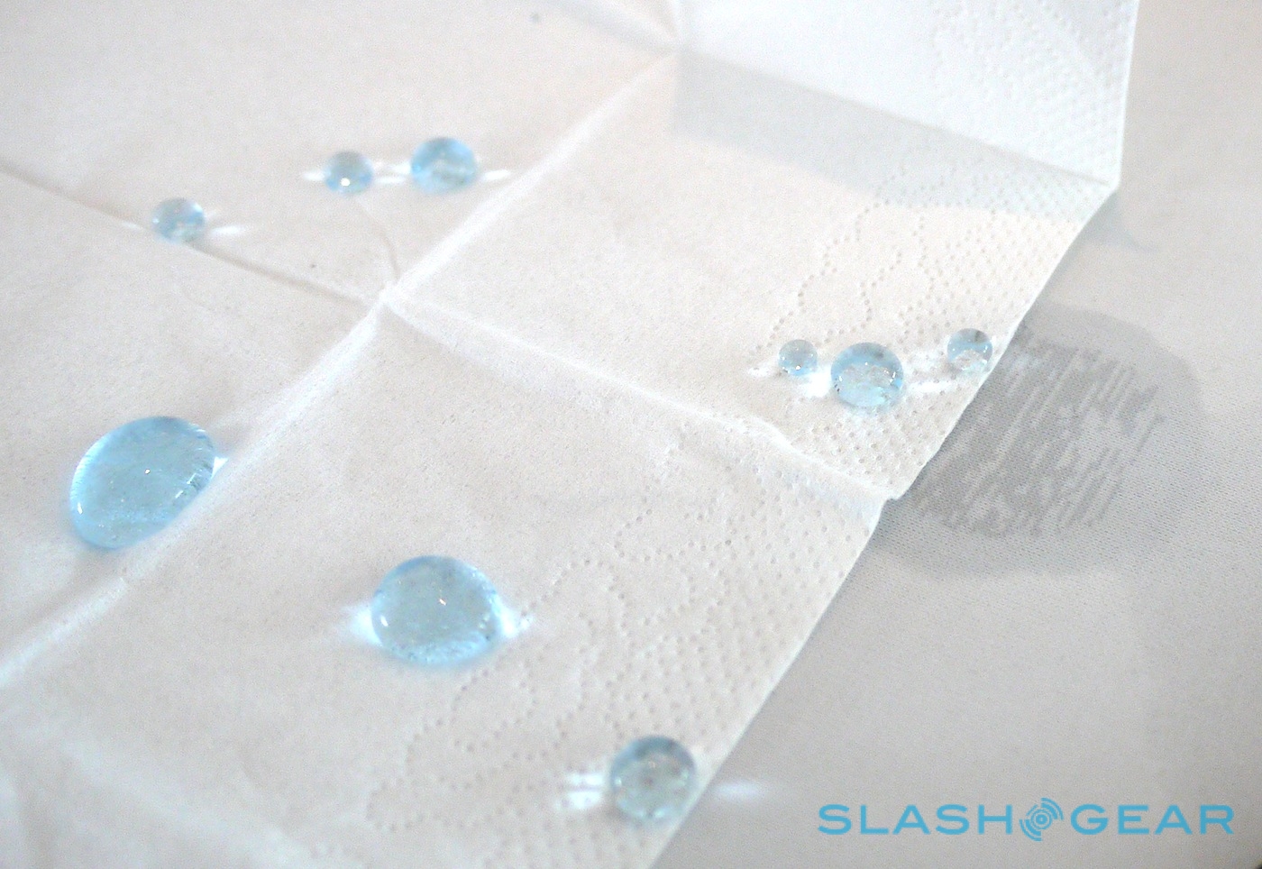 As the brief video demo below shows, P2i's treatment technology isn't limited to gadgets. The napkin in the clip is regular paper that's been put through the Aridion process; that makes it impervious to water, though you can't notice any difference in terms of touch. Droplets simply bead on top, and you can see the difference where they spill over the edge and are instantly absorbed by the tablecloth.