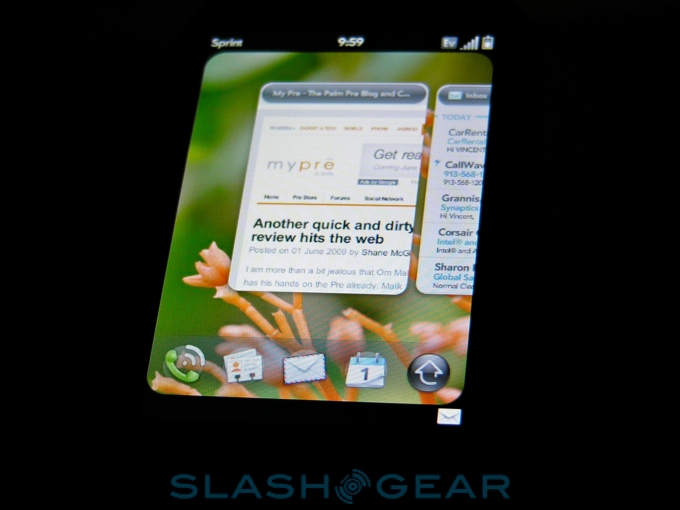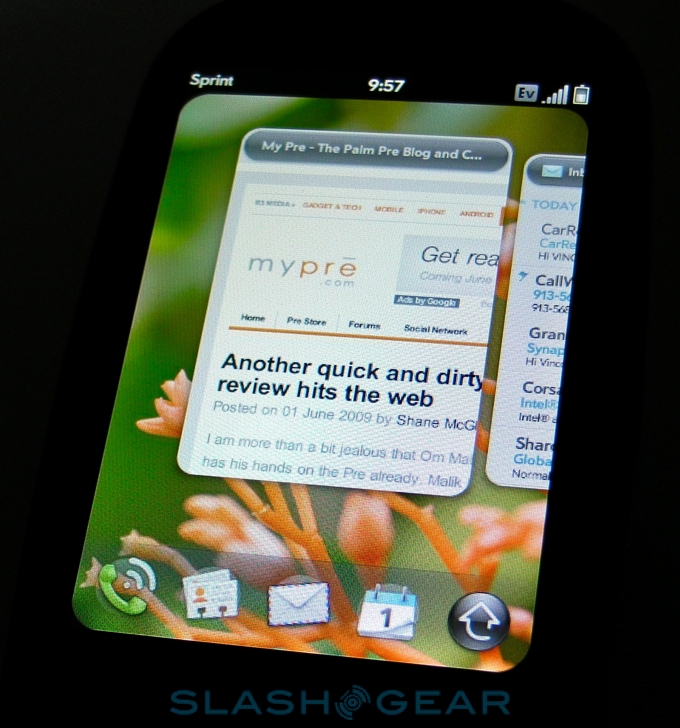 webOS is a true, multitasking platform, treating individual open apps as different cards that can be shuffled, fanned through and flicked away to close. Palm are yet to put a hard number on how many cards can be open at once – they say it's a function of individual memory use more than anything – but we had in excess of 9 to 12 open with no problems. Put simply, webOS' main advances over previous Palm platforms can be boiled down to three areas: Synergy, Universal Search and multitouch with gestures. The latter is one of the most obvious improvements, using swipes and flicks to handle webOS' cards – each a separate app or webpage – as well as call up the quick-launcher menu.