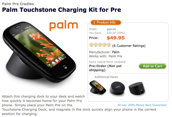 One of the Pre's more striking accessories is the Touchstone, a $70 inductive charger that goes on sale alongside the smartphone and works as a desk-stand for it. Thanks to the Pre knowing when its on the magnetic Touchstone, it can automatically switch between the speakerphone and earpiece when put down or picked up mid-call, and lifting a ringing Pre from the charger automatically answers the call. Neat, but Palm's decision not to bundle a wall adapter with the Touchstone and instead expect you to use that which came with the Pre feels cheap, and the fact that a standard computer USB port won't put out sufficient power for the Touchstone's liking is frustrating.