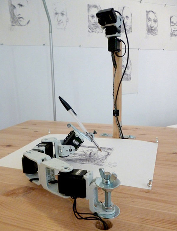 Tresset built the robot arm with loot from a grant for research. Tresset said that he made the bot sloppy and clumsy to "touch people." I'd think it was cool even if the portraits were more precise. Still, Paul the robot arm draws faces with an ink pen better than I can. Future iterations of the robot will have software that allows the bot to view the drawings it makes and then improve them.
