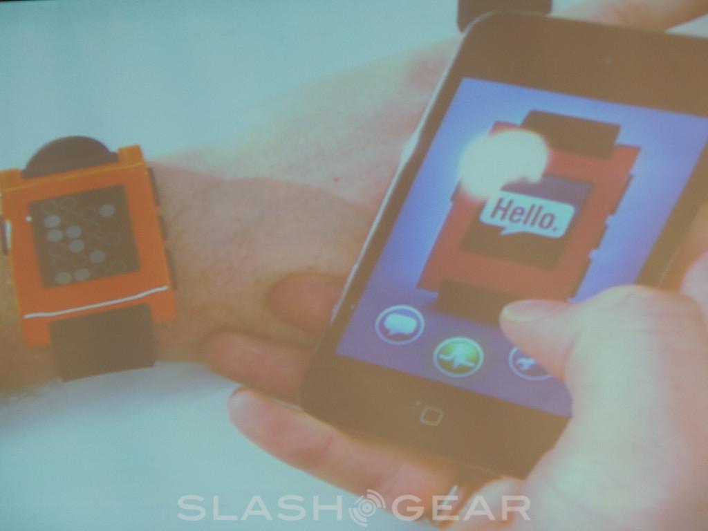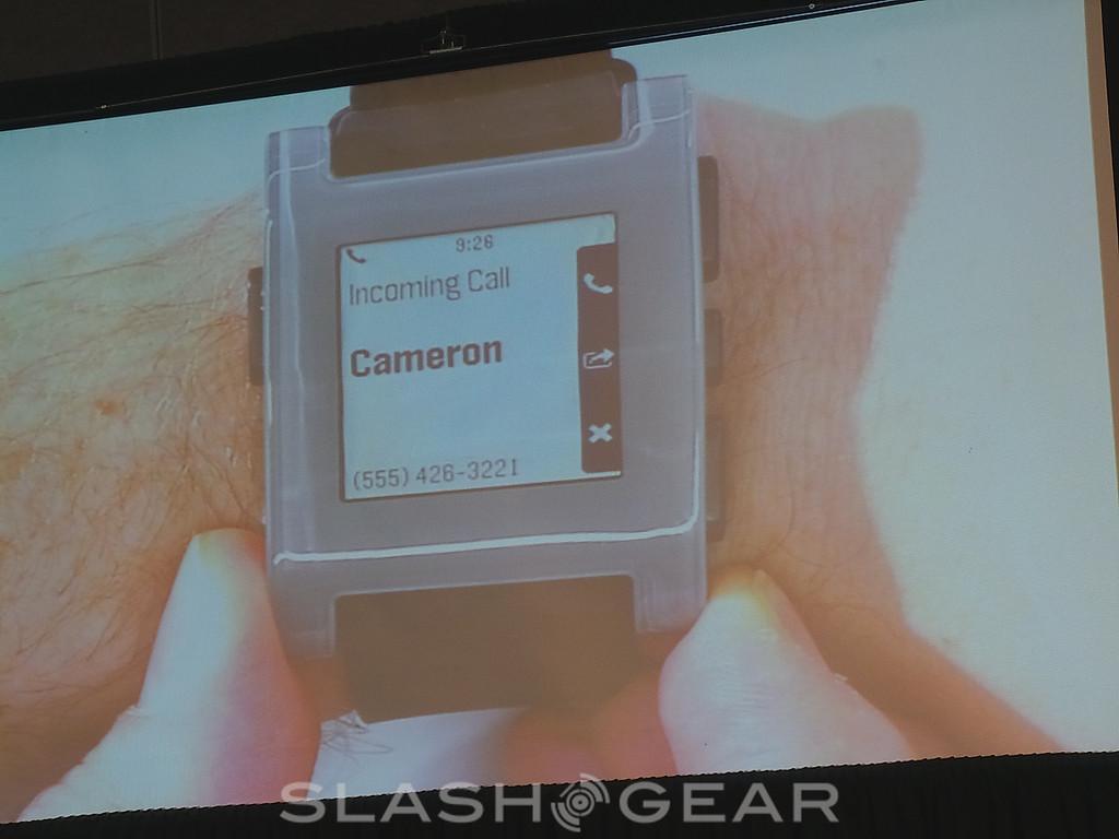 Pebble also demonstrated the music interface, with the smartwatch paired with an iPod and used to scroll through a playlist. The watch shows what's currently playing on the display, and thanks to the waterproofing, you could even use it to control playback while you're in the shower. The accelerometer is used for controlling the backlight, with a simple tap of the watch turning on the display.