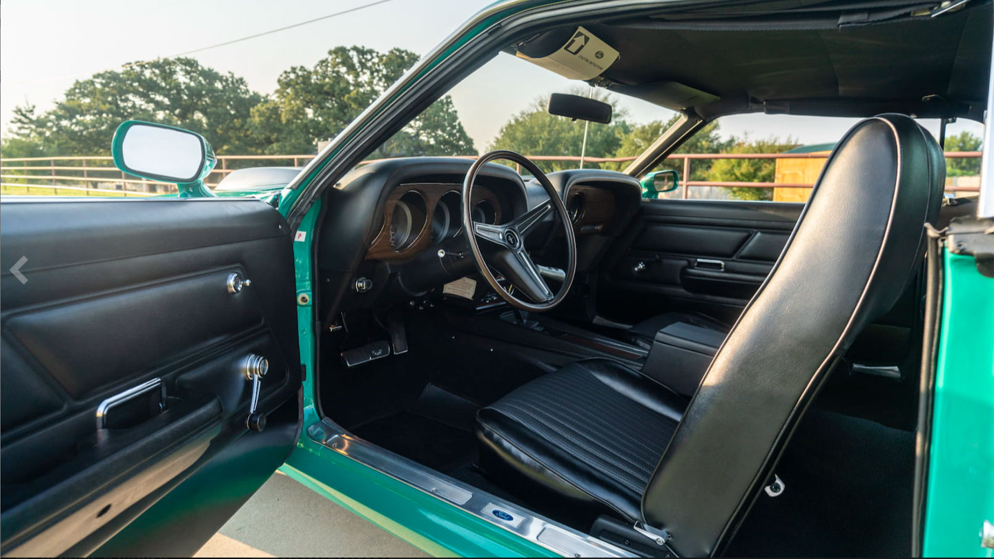 The 429 cubic-inch V-8 is paired with a four-speed close-ratio manual transmission. A nationally recognized Boss restoration facility gave it a concourse quality frame-off restoration. The car is Grabber Green on the outside with Black Clarion knit/Corinthian vinyl interior.