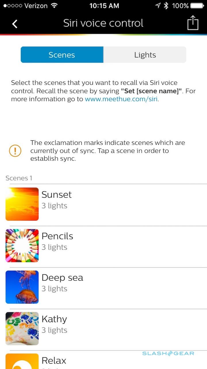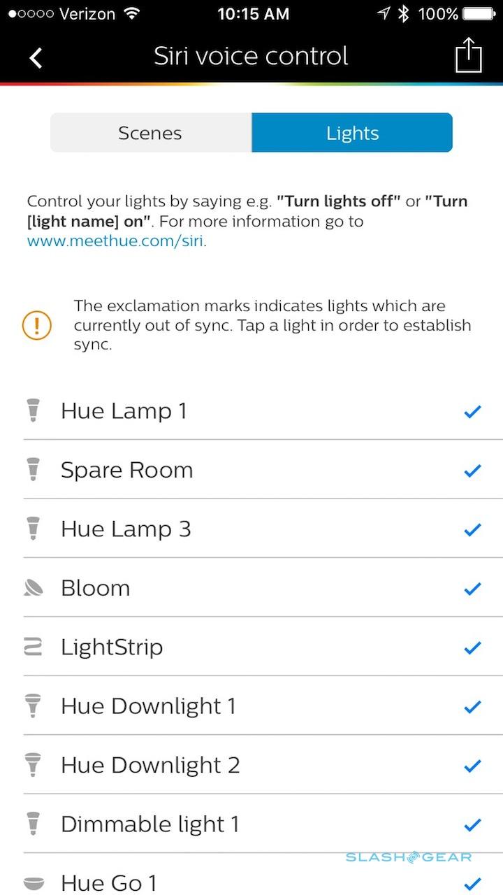 With the Hue app alone, you can use Siri to command the lights as a single set, or select one or more scenes that Siri will be able to recognize (each with up to twelve bulbs assigned). You can also pick out individual bulbs to be controlled; each needs to have a unique name, and one which isn't already in use by Siri for an existing voice command.
