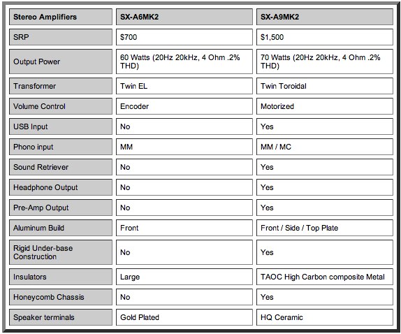 The SX-A6MK2 (SRP: $700) features Twin EL Transformers and the SX-A9MK2 (SRP: $1,500)employs Twin Toroidal Transformers, which are highly efficient with very low magnetic leakage. Both components increase available power, prevent signal interference and virtually eliminate noise even at extremely low frequencies. The SX-A9MK2 model is also equipped with a USB input, allowing high-quality transmissions of higher bit-rate music files such as an MPEG or FLAC from any enthusiast's digital music library.