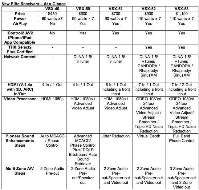 LONG BEACH, CA – (June 7, 2011) – Pioneer Electronics (USA) Inc. today unveiled its new line of Elite® branded AV receivers designed to meet the needs of today's connected consumers and their portable devices. The five new Elite models, consisting of the VSX-40 ($450), VSX-50 ($600), VSX-51($700), VSX-52($900) and VSX-53($1,100), incorporate state-of-the-art performance and specifications based on Pioneer's uncompromising standards of engineering and manufacturing. All five new receivers utilize the renowned Elite audio and video technology and the VSX-50 and up have advanced network features like Pioneer's proprietary iPhone and iPad apps including iControlAV2¹ and Air Jam², as well as Apple's AirPlay, DLNA Certified® (1.5) and Internet radio to become the hub of a consumer's home network and entertainment system.