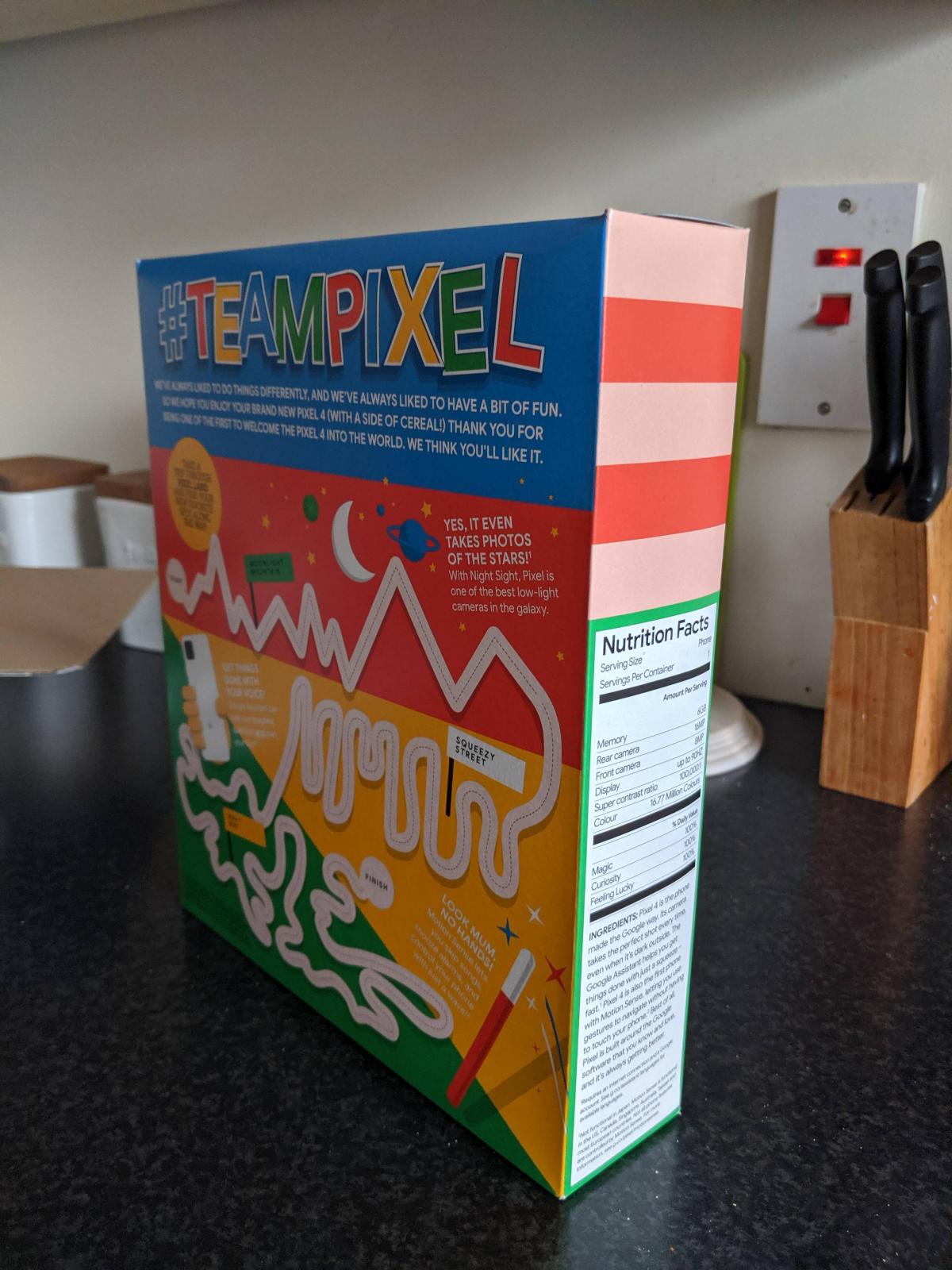 Google's UK team creatively made use of the standard design of cereal boxes to advertise the Pixel 4's features, including the rather confusing unlimited free cloud storage for photos (depending on the size or quality). Instead of food stats you get a few tech specs and instead of ingredients you get a rather lengthy marketing blurb. And, of course, there's even an extremely simplistic maze game too.