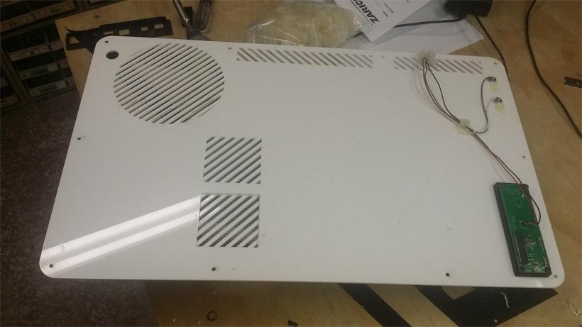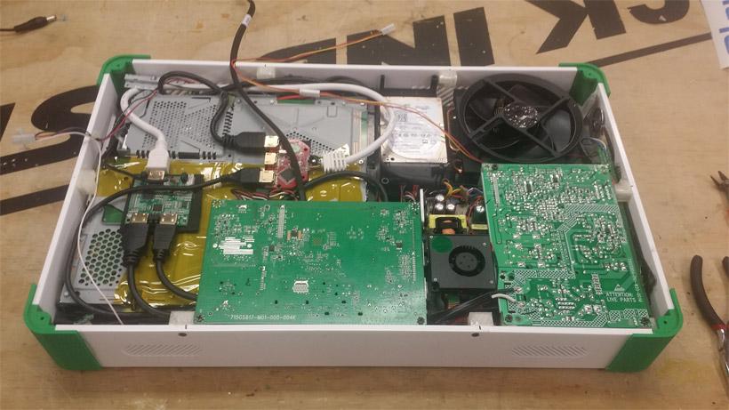 The builder says that you can always turn the PS4 on using the controller though. The screen is a 22-inch Vizio unit, the PS4 is housed on the left side of the laptop enclosure, and the Xbox One is on the right side. The device uses a single power cord for power and does have to be plugged in to work.