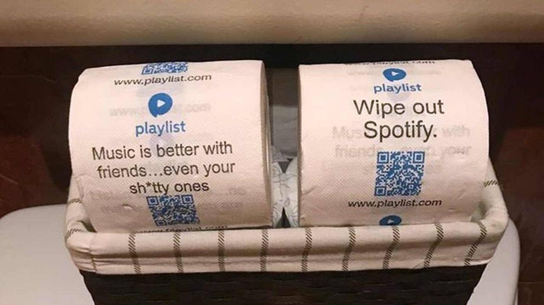 On the toilet paper, the designer of this Playlist-aimed campaign also printed "Music is better with friends... even your sh*tty ones," which isn't great grammatically, but for this situation it's just fine. While there seems to be more messages on the roll, we've been unable to get anyone in photo distance to unroll the roll – and the designer hasn't yet showed themselves publicly, so we're waiting for that email for the full story.