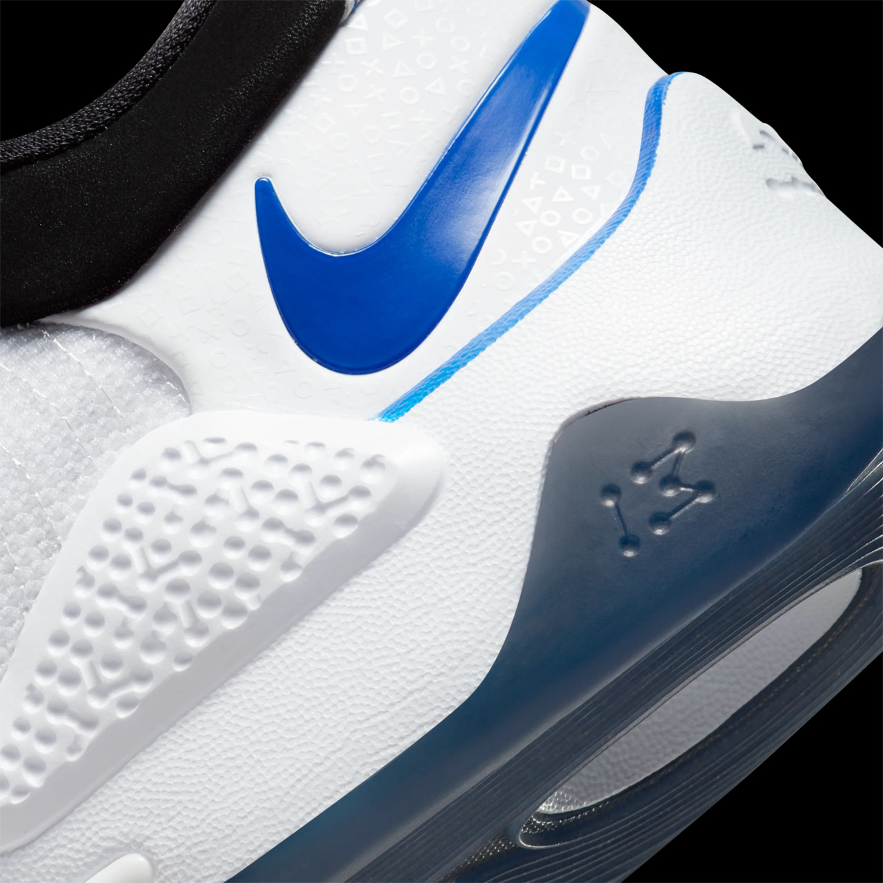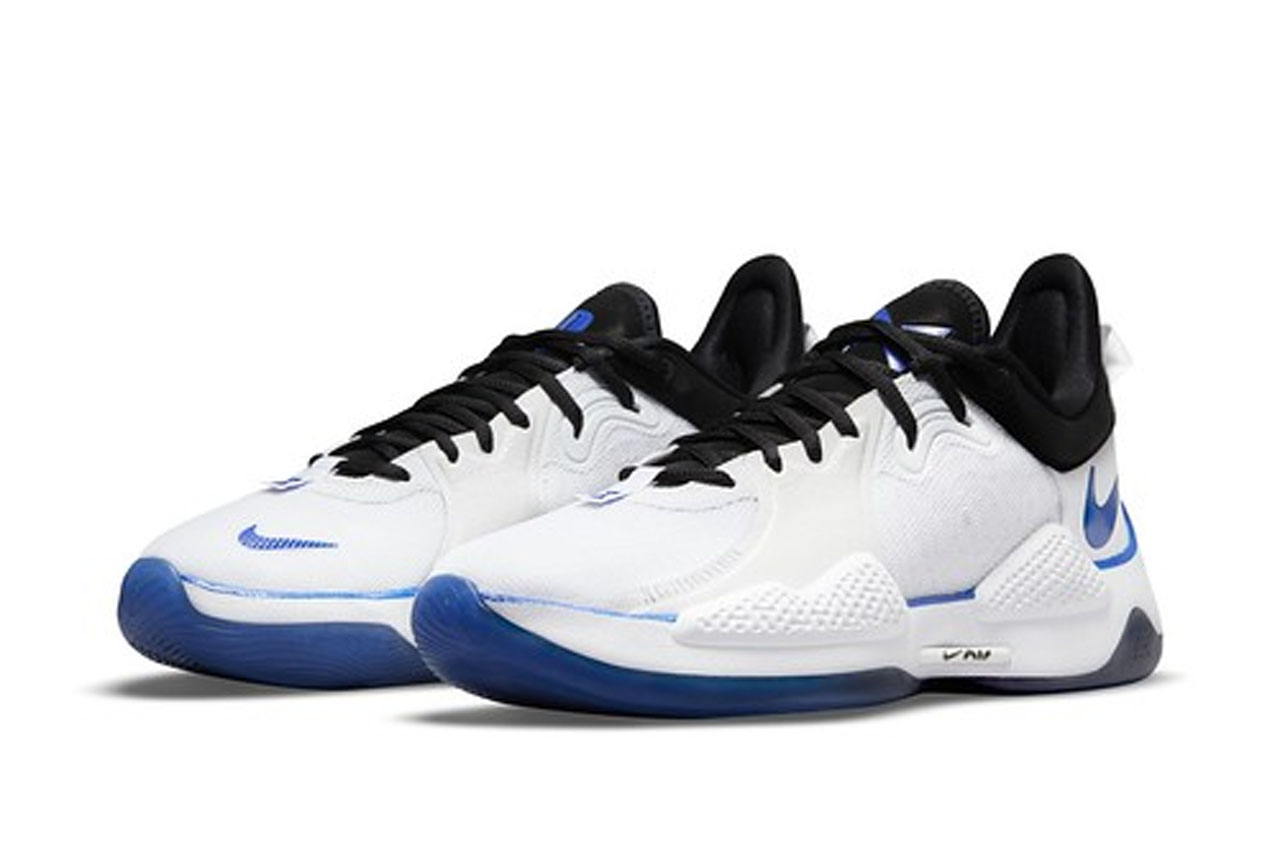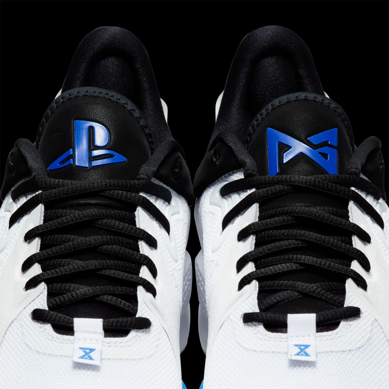George says the tongues of the shoes have the PG and PlayStation logos, just like his PlayStation collaborations. Shoe colors are black, white, and blue and were heavily inspired by the industrial design of the PlayStation 5 console. The sneakers do feature PlayStation 5 references on the sock liner and outsoles.