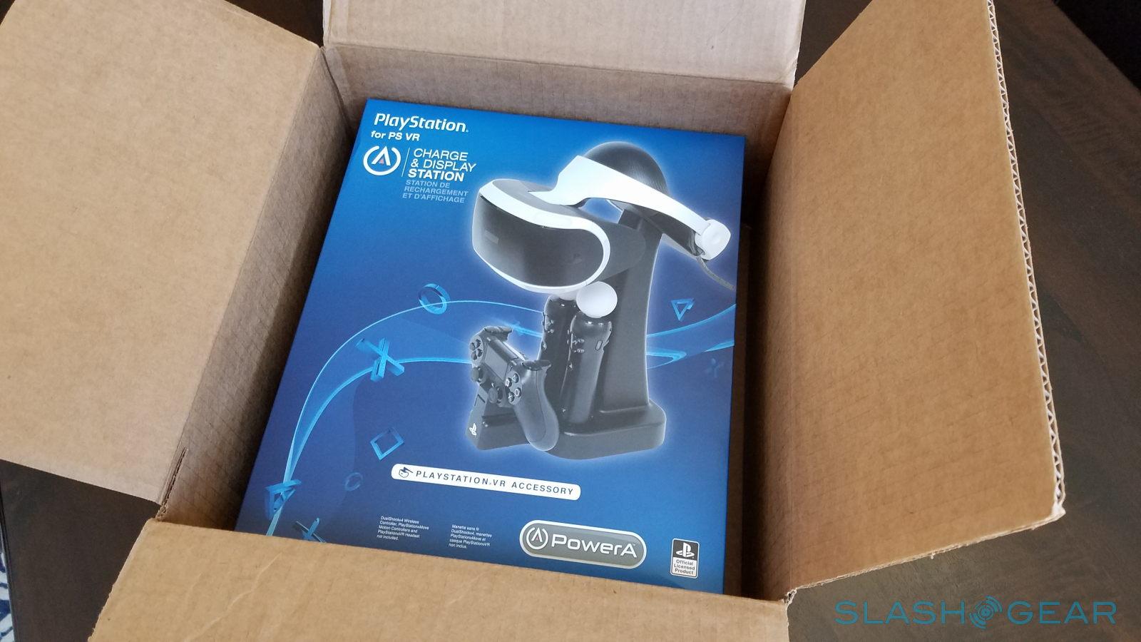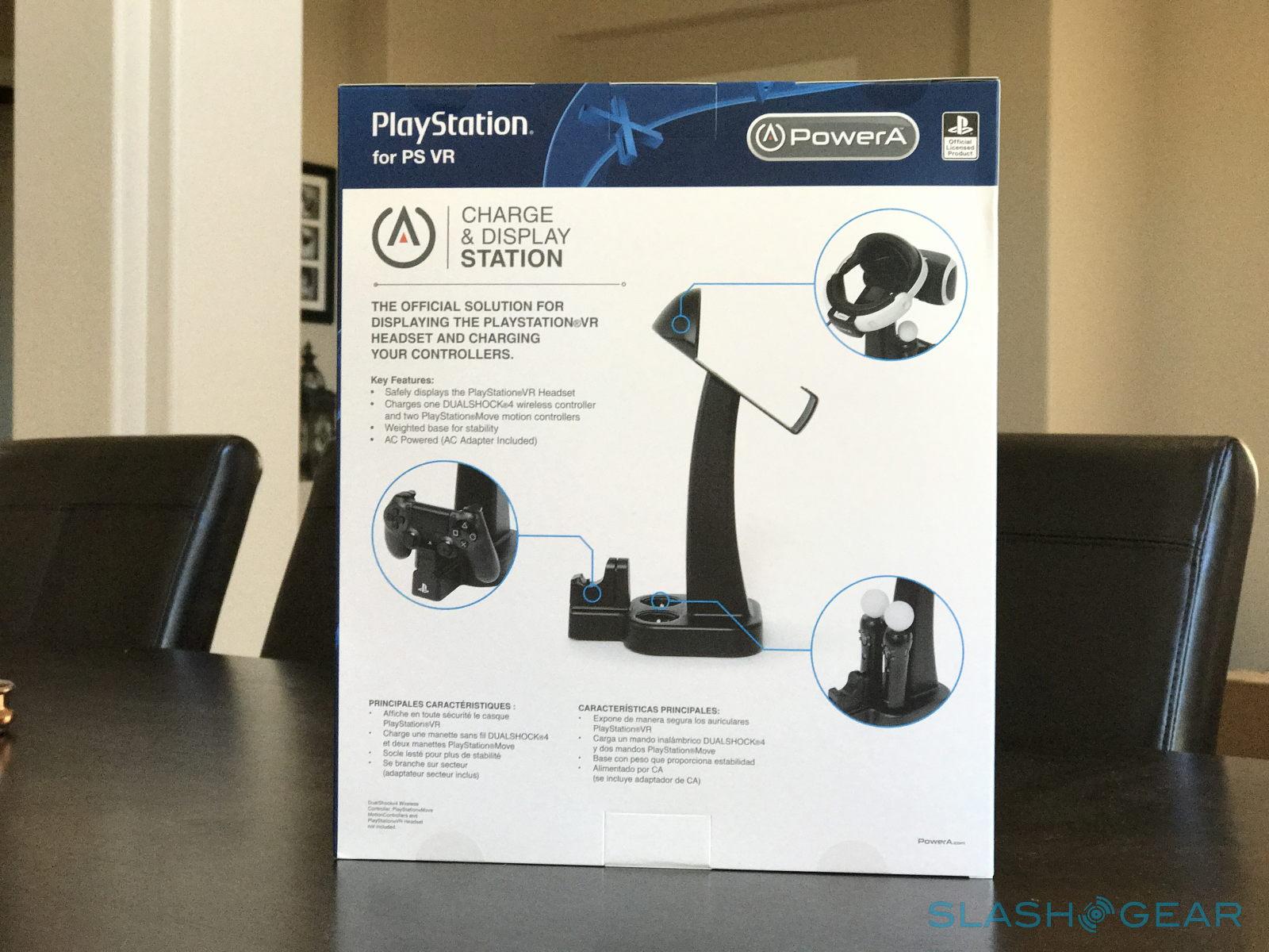 And when you're done playing for the day, you will inevitably need a way to keep those pieces from getting lost. You also need a way to charge the components, like the headset itself and the controllers. Fortunately, there are a few officially licensed accessories for that, like PowerA's Charge & Display Station, which not only charges the VR headset, PS Move controllers, and DUALSHOCK 4, it also holds places them on a pedestal for showing off.