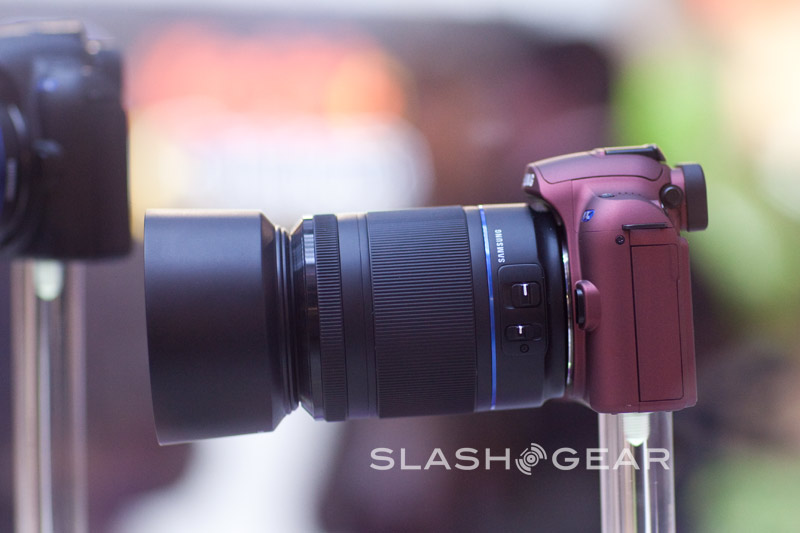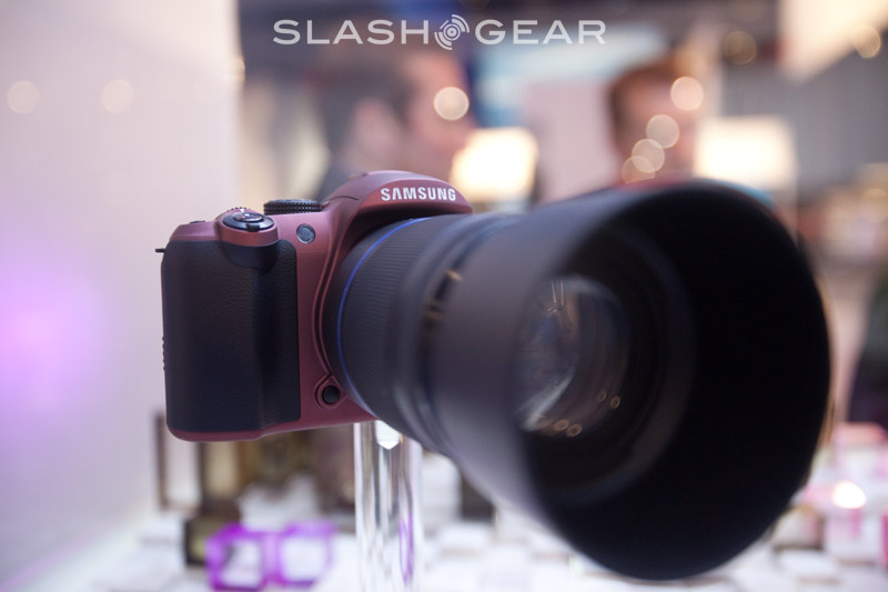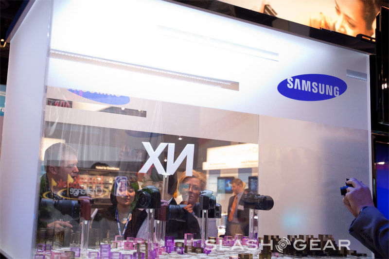 Locked and sealed in mirror box, that's where the concept cameras being displayed at Samsung' booth. We didn't get a hands-on opportunity, nor did Samsung disclose any further technical details, but managed to snap a few shots for your viewing pleasure. Three different lenses looked like a wide-angle, a mid-range and a "pancake" are mounted on display units, thus interchangeable lenses will be offered when it's official; no models, price range or MP size is concrete at present time. The mystery hybrid, however, will get HD video and WIFI connectivity.