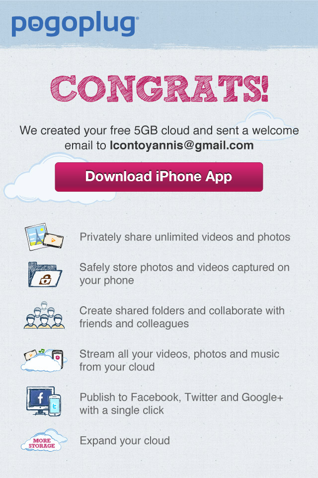 Pogoplug has launched a cloud storage service, Pogoplug Cloud, offering 5GB of free online storage space and seamlessly integrating with the company's personal cloud storage devices. The new online store – available through the desktop as well as via iOS and Android apps – can be used to stream photos, music and video from, create shared document folders, or act as an automatic backup of photos and video filmed on your smartphone. Those wanting more capacity can either pay for a bigger space on Pogoplug's servers or throw in a home unit instead.