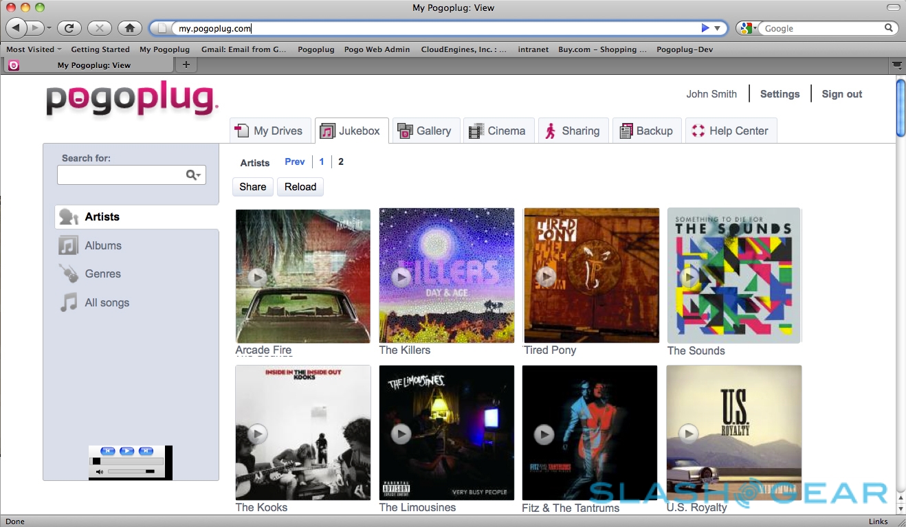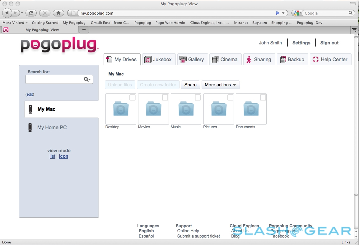 Finally, there's a link to the my.pogoplug.com site, which pops up in your browser already logged in and showing what folders you've shared from your computer. As well as the software client, Pogoplug has updated the web interface and it's much cleaner than before. Any Pogoplug connections – hardware or software – show up in the left hand column, with tabs for basic file manager view, a Jukebox of music files, Gallery for images, Cinema for video, Sharing for any files or folders you've enabled third-party access to, and Backup for automatically copying folders between drives.