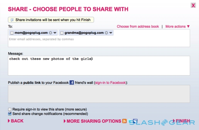 You don't have to access files via the website; the Pogoplug app also adds a folder to your computer through which you can easily see any files that have been shared with you. Sharing was one of the easier elements of the Pogoplug experience, and that's carried forward with the new software. Hit the share button, choose the folder(s) you want to grant access to and then enter one or more email addresses and, optionally, a personal message.