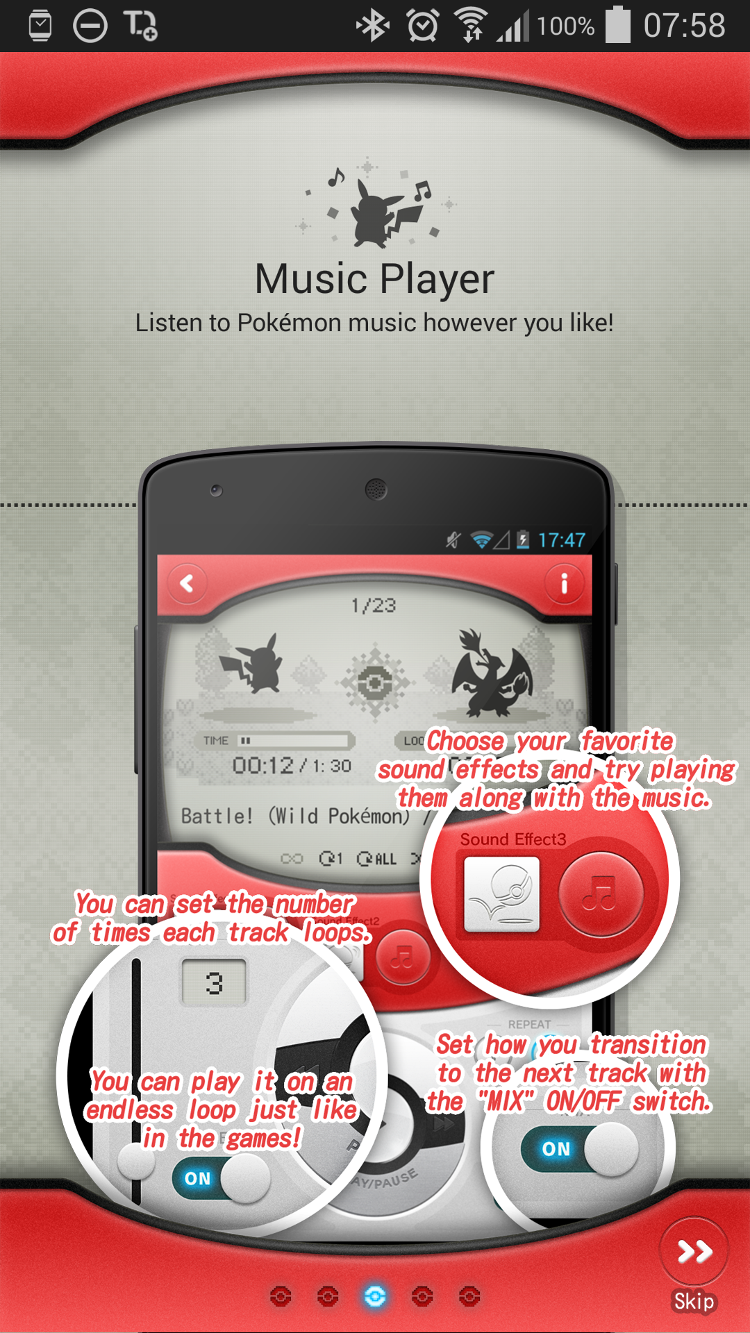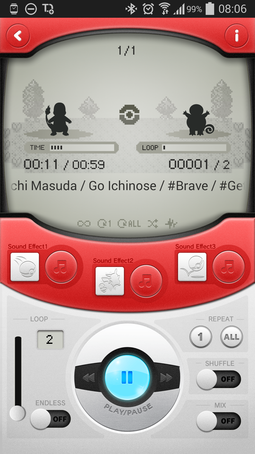 As for the app itself, it's pretty much in line with the Pokemon aesthetic, which means it is both game-like and can be a bit confusing given all the knobs and controls at the same time. The music player interface lets you loop through the music as many times as you want, even infinitely. The top part of the screen displays a simple animated silhouette of a Pokemon battle scene. Amusingly, you can also inject a bit of whimsy by selecting three sound effects from the game that you can tap on any time you desire.