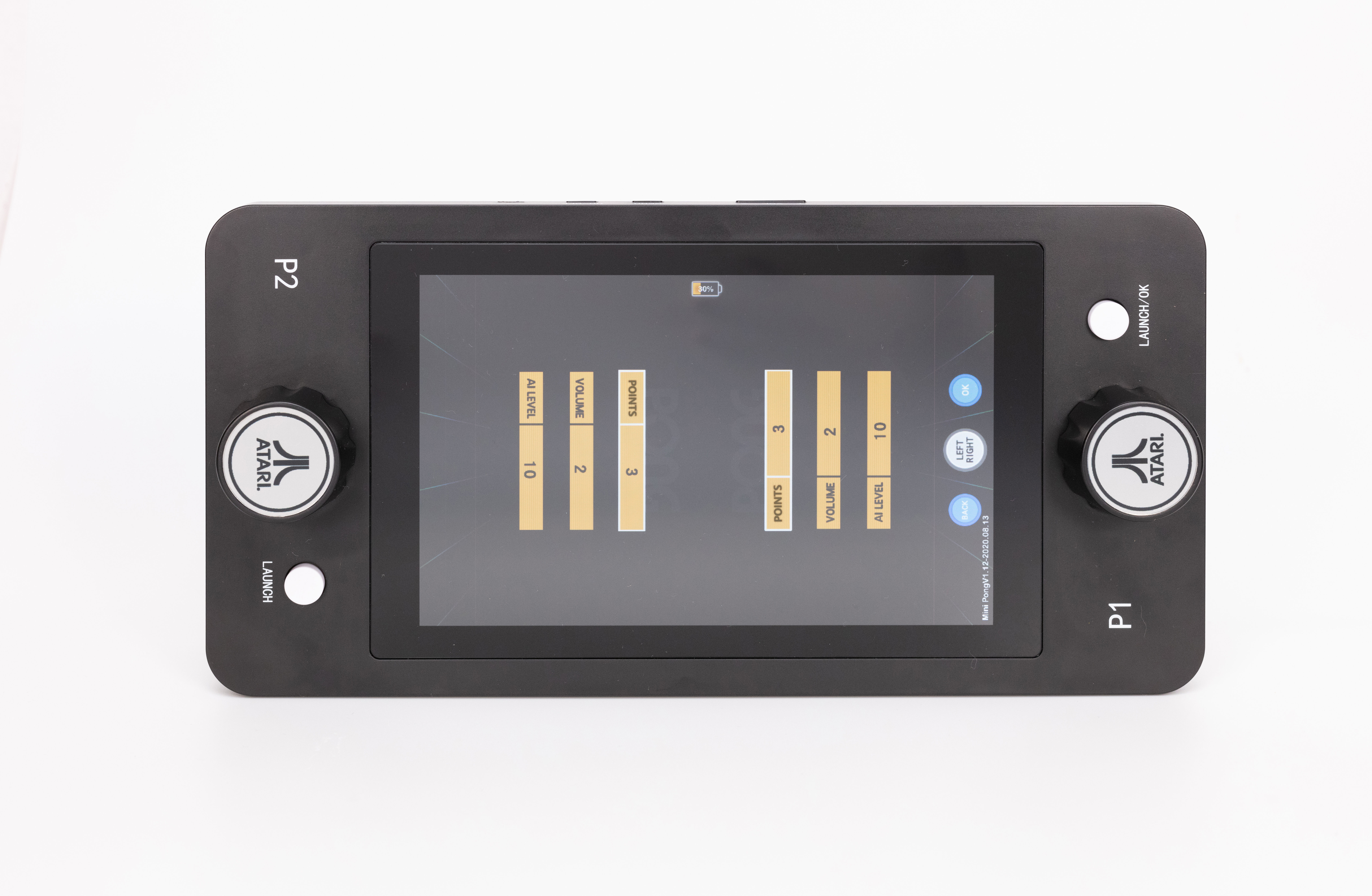 The 7.9-inch LCD display is controlled entirely by hardware dials and buttons. There's a button to launch, and a dial to move the paddle back and forth. It's like Breakout (brick breaker), but... for PONG. If you're 30+ years old right now, you might remember the last massive sit-down console machines at restaurants/bars/pubs with the dial control – this is sort of like that, but far, far smaller.