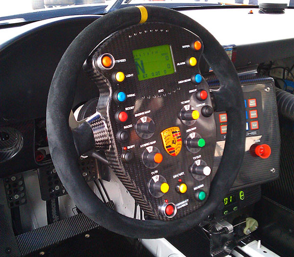 The picture you see here is a shot of that Porsche racecar steering wheel. It appears to be covered in alcantra, which is a great material for grip and comfort during long races or driving. This is one of the strangest looking steering wheels ever though with all the buttons and knobs on the thing. I'm not going to pretend to know what all of those buttons and knobs are for, but I can see a few labels I recognize.