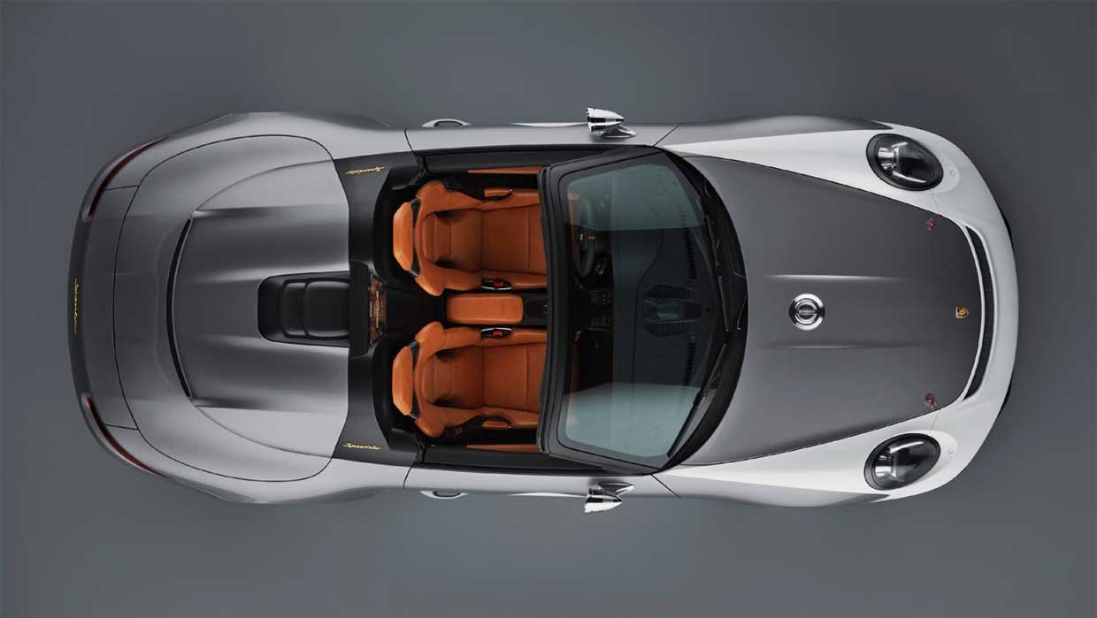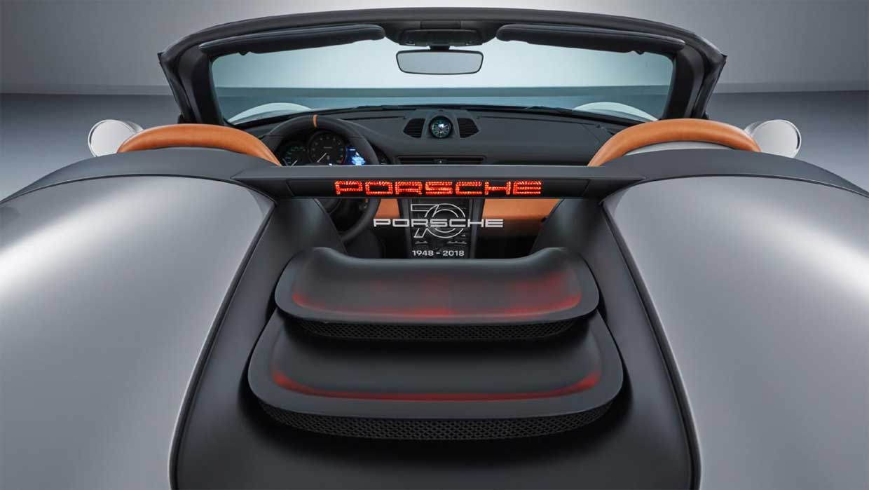 Those touches give the car what Porsche calls a "very low fly line" meant to remind of the Porsche 356 1500 Speedster. A rear cover made of carbon fiber connects behind the front seats covering a roll-over protection structure. That cover has a "double bubble" design that is a traditional element of the car from the 1988 911 Speedster.