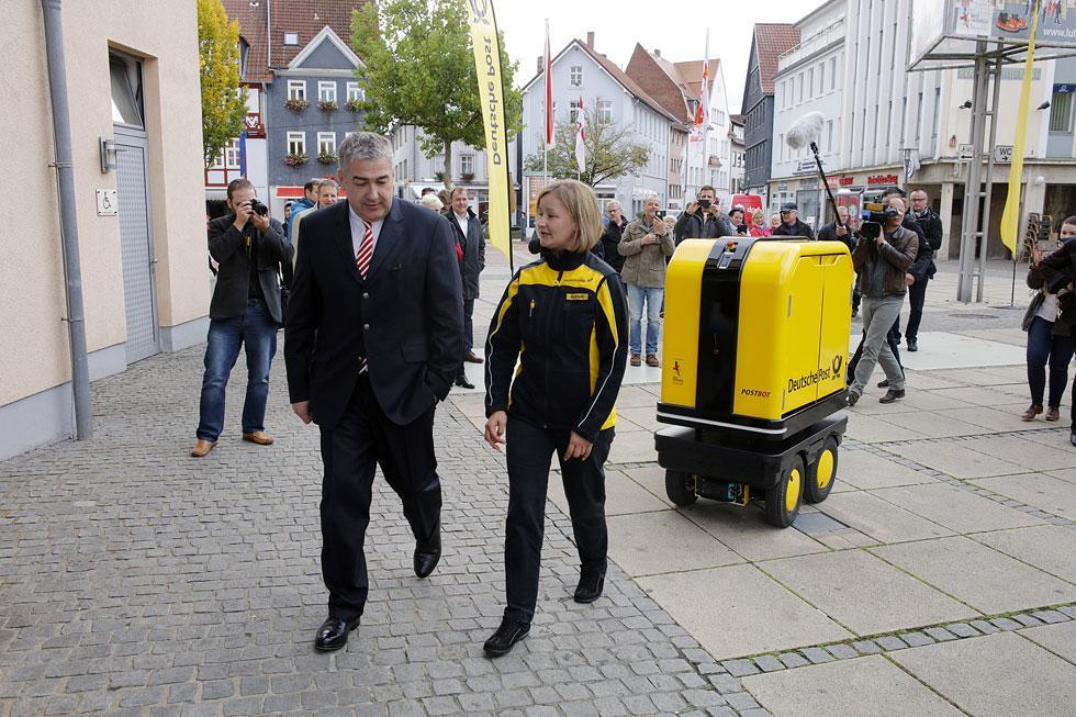 The German town of Bad Hersfeld has been chosen as the test location for a new delivery robot dubbed PostBOT that will be used to help mail carriers make their deliveries. The robot will carry mail items for the mail deliverers on their routes to make delivery of items easier. PostBOT has enough space inside to carry up to six post trays.