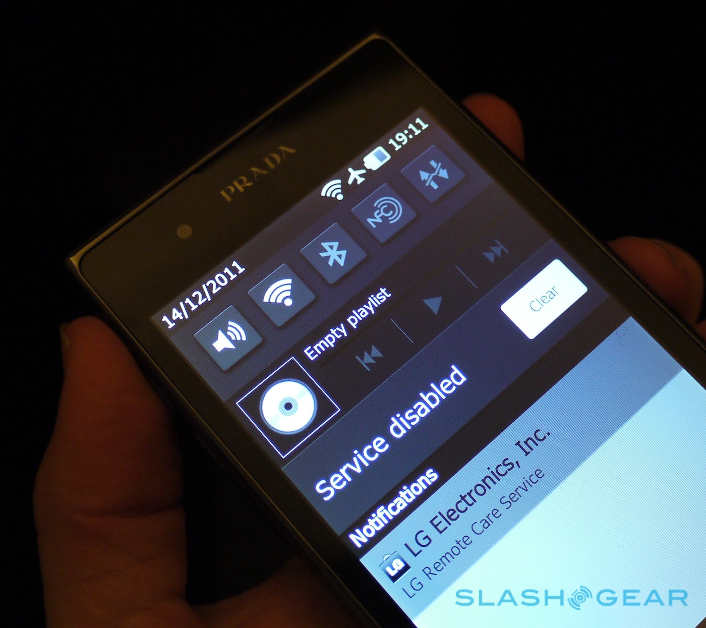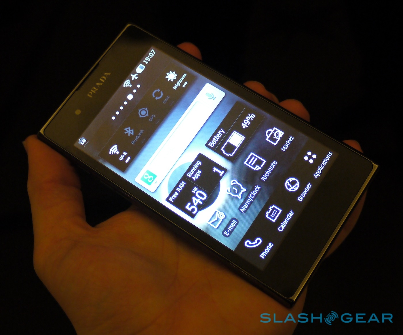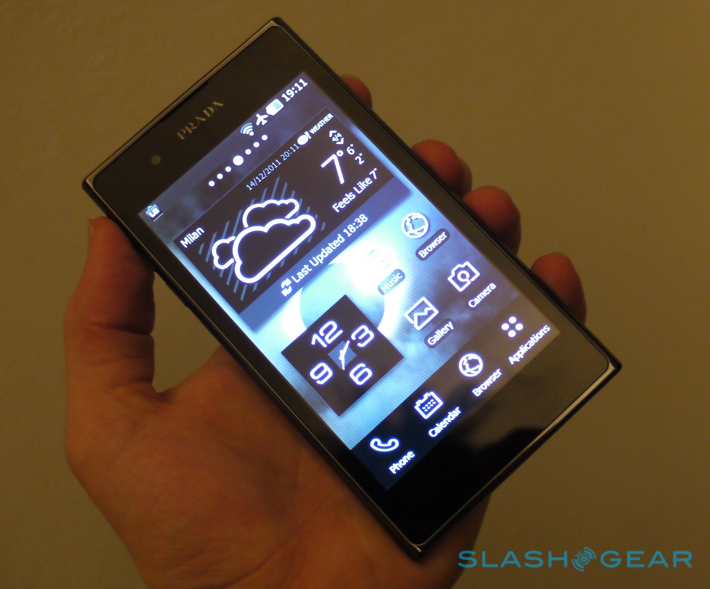 Performance from the 1GHz dual-core TI OMAP4430 processor – paired with 1GB of RAM and 8GB of storage – is swift, with the custom PRADA theme whipping past neatly and apps loading with nary a delay. There's a comprehensive set of icons to choose from, even if you're using a third-party app, along with some exclusive widgets for time and weather. Pull down the notifications menu and there's a music control bar and power toggles.