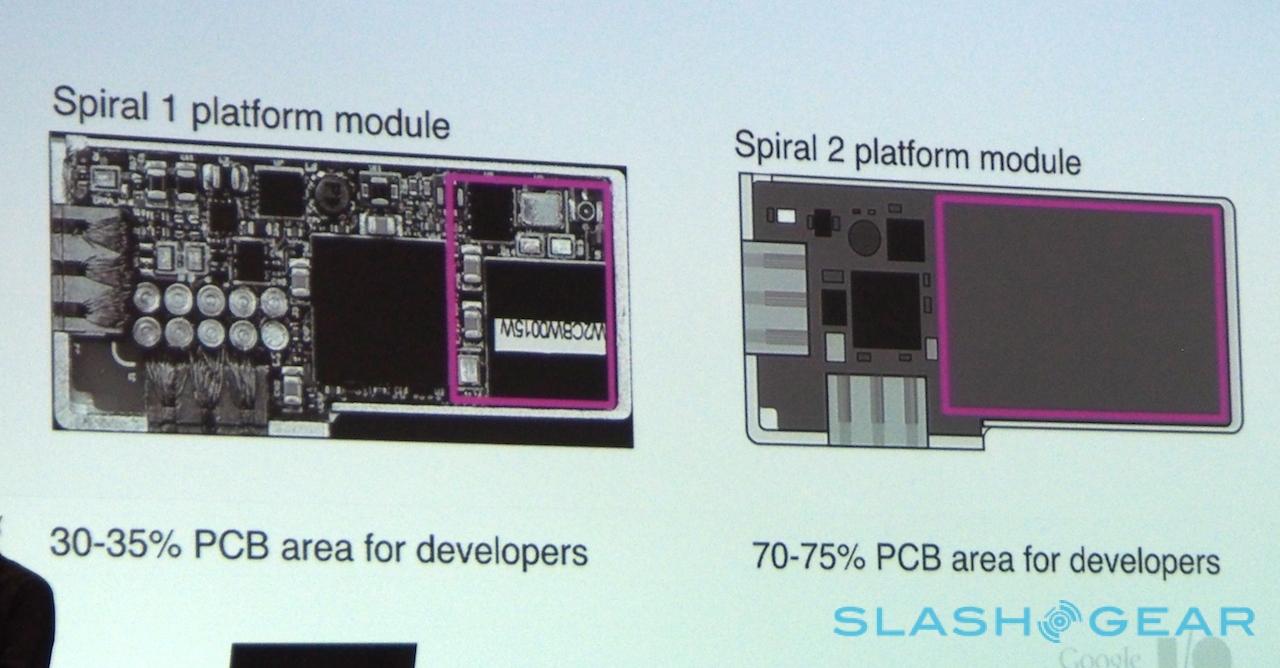 Google is also looking at how best to offer module manufacturers the most space for their own choice of components. The current "Spiral 1" platform modules free up around 30- to 35-percent of the PCB area for manufacturers; using a new Unipro chip system, however, Google expects to eventually be able to offer 70- to 75-percent with a new "Spiral 2" platform.