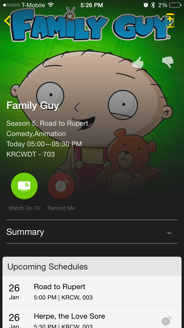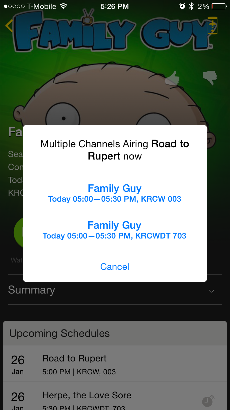 Though it's good as a Cable controller, my experience showed me Pronto thought I wanted to watch on-demand TV a lot. In trying to watch Family Guy, I selected the show, then "watch". It natively directed me to some odd Comcast on-demand screen I've never seen. Once I selected the show and then the channel I wanted from the dedicated show screen (seen above), things were fine.