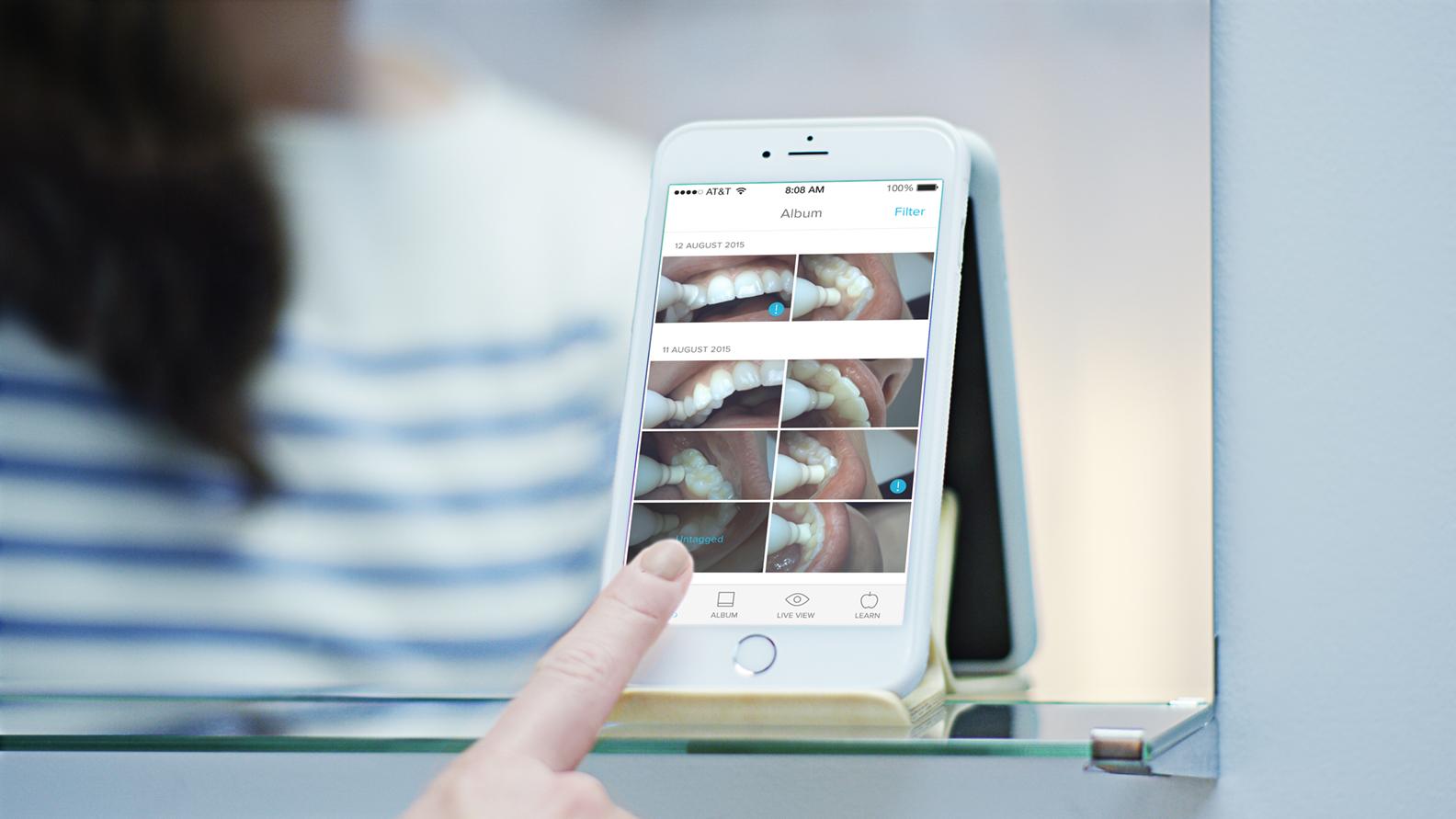 That video camera allows you to see what is going on in your mouth by synchronizing the live video with your smartphone via Bluetooth and WiFi. The idea is that the live video feed will help you to see spots you missed inside your mouth when you are cleaning. The app can also track progress towards oral health goals and provides motivating tips to help with the brushing routine.