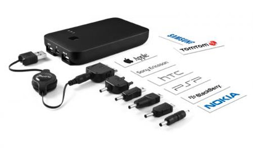 The battery pack has a retractable cable and a bunch of tips that easily interchange to allow charging of the iPhone and iPad, Sony Ericsson phones, HTC phones, the PSP, Blackberry smartphones, and Nokia devices. You can power any micro USB device with the battery pack.