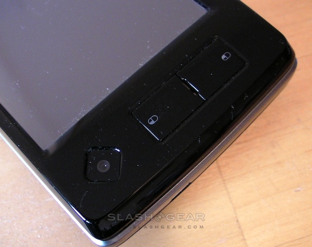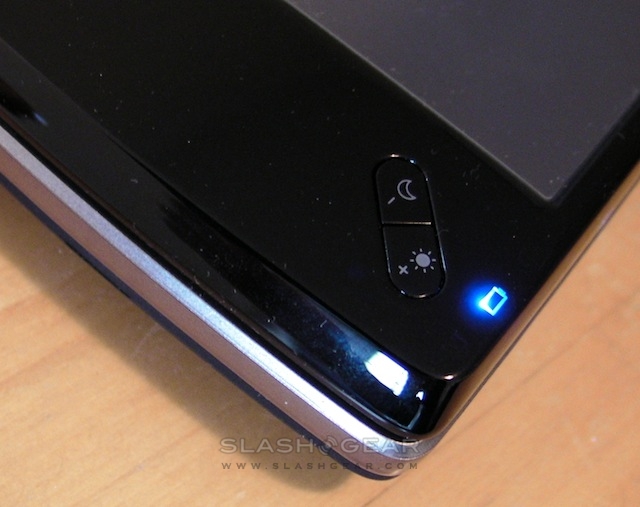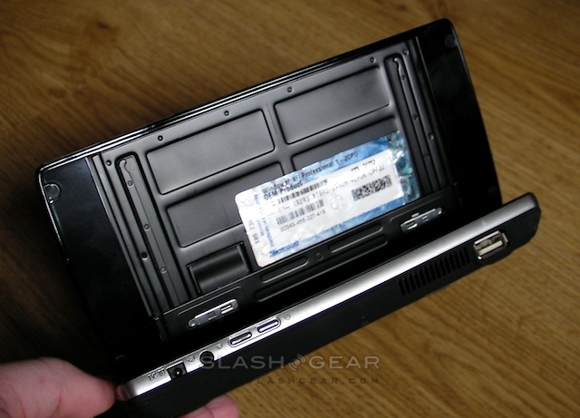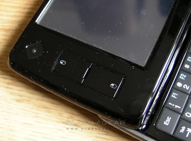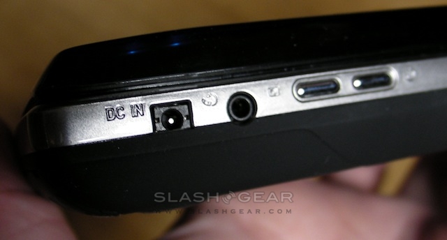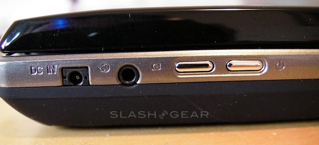 The whole thing measures in at 174 x 84 x 25 mm and tips the scales at 430g, a fair chunk of which is the 1,850 mAh battery that slots into side of the UMPC. Most distinctive of the form-factor is the PsiXpda's slide-and-tilt display; it's a little like an HTC Touch Pro2, though obviously larger. The display is flanked by a VGA webcam and left/right mouse buttons on the left side and brightness buttons plus a trackpad on the right side, and there are LED indicators for battery and HDD activity just above. On the top edge there are two buttons, one for power and another to temporarily turn off the display, handy for saving power but keeping the UMPC ready for instant use.