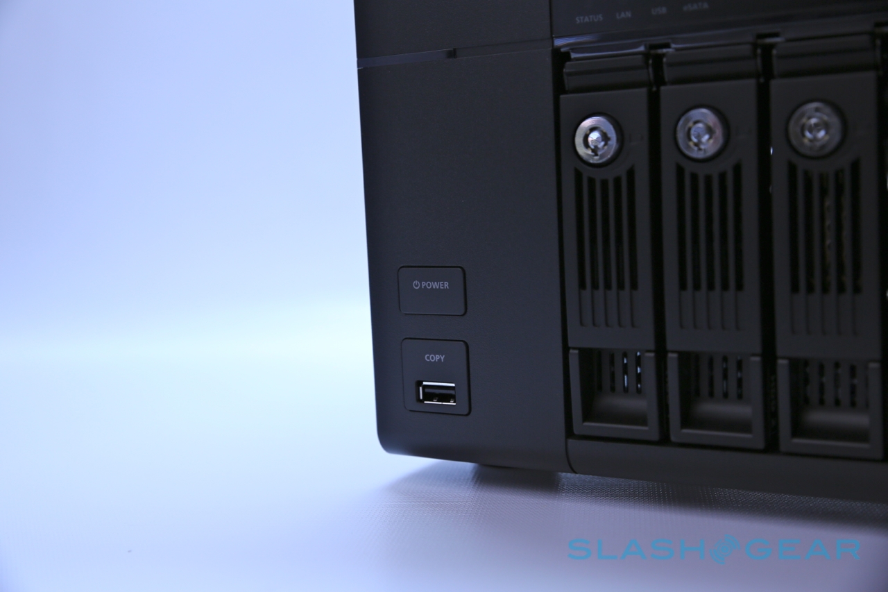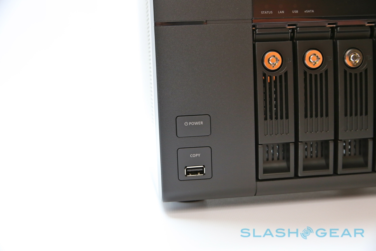Up front there are six individual drive bays, each hot-swappable and with a security lock, topped with a two-line LCD to show status and settings; a pair of buttons alongside allow you to navigate through the simple menu structure. Each bay gets status LEDs, and there's a front USB 2.0 port with an instant-copy button for quickly offloading content from an attached drive or memory card (in a USB reader).