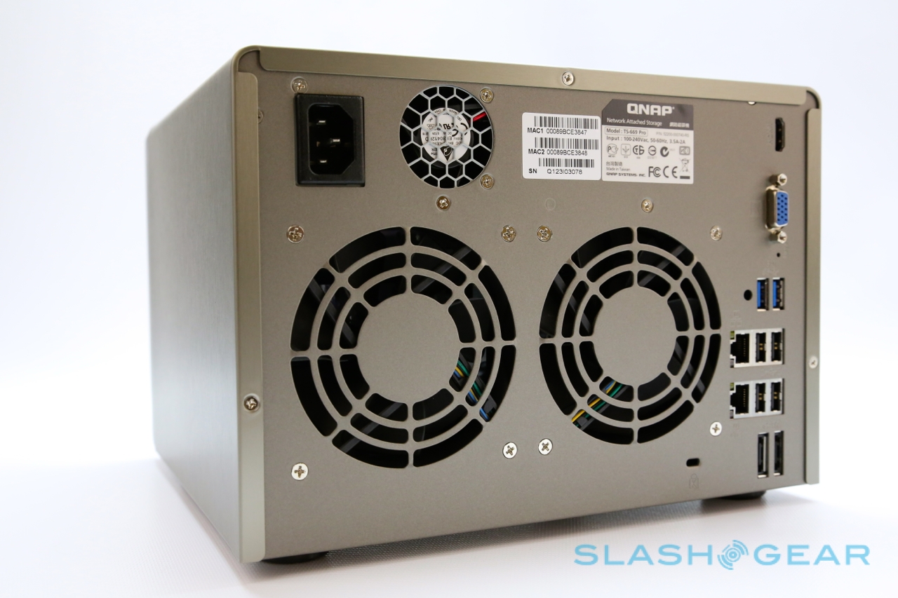 On the back, meanwhile, QNAP gives you more than the average number of ports for a NAS. There are a further four USB 2.0 ports, two USB 3.0 and two eSATA, along with a VGA port that's reserved for maintenance use; two gigabit ethernet ports handle networking duties. You also get a total of three fans, one dedicated to the power supply and the other two 90mm fans for keeping the drives from overheating. In use, there's a noticeable whirr but not a tremendously intrusive one, though it's more suite to the home office, study or workplace than the living room.