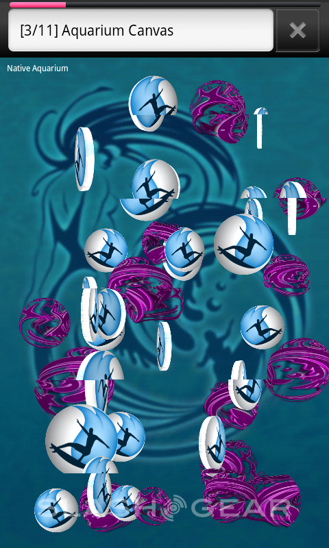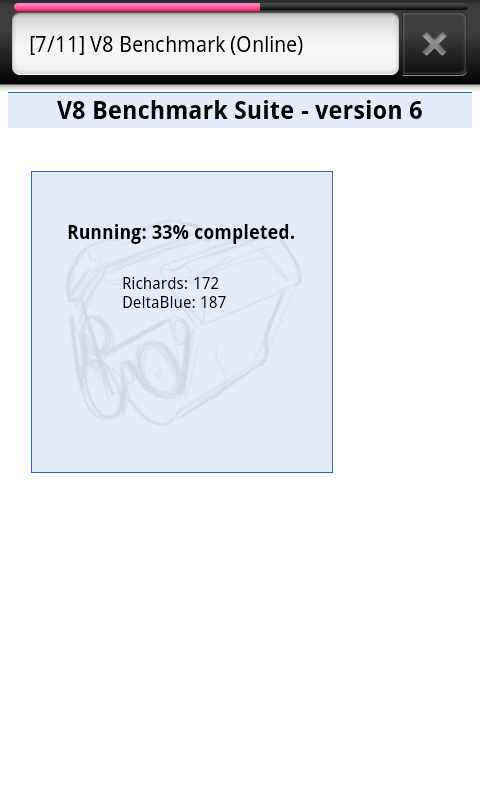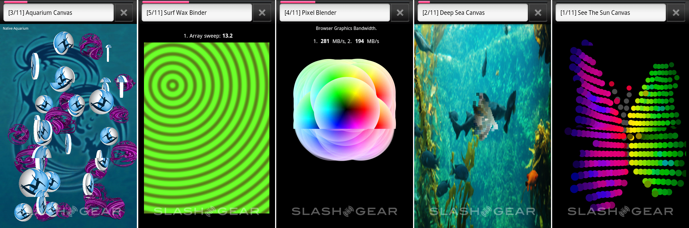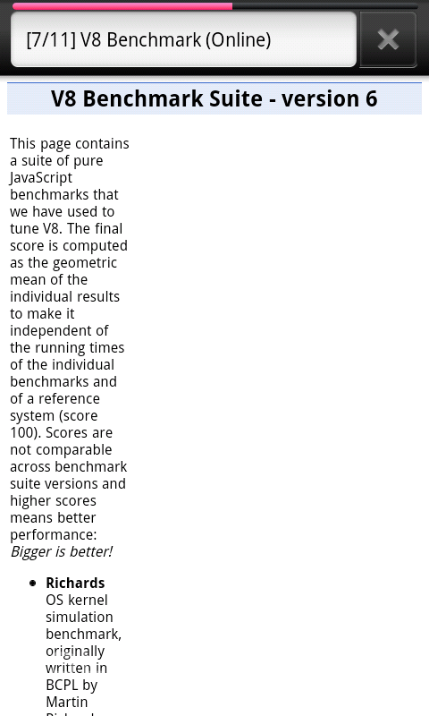 Rendering, Deep Sea Canvas: Tests the performance of HTML 5 Canvas-based graphics.Rendering, Aquarium Canvas: With many simultaneous objects, this stresses the performance of both the HTML 5 Canvas-based objects and the JavaScript engine.Rendering, Pixel Blender: Measures the web graphics-related bandwidth available for blitting and blending operations.JavaScript, Surf Wax Binder: Tests the array performance of the browser's bindings between the Browser and JavaScript engineJavaScript, Sun Spider (Online): Measures JavaScript performance using Rev 0.9.1 of the industry standard Sun Spider suite.JavaScript, V8 Benchmark (online): Measures JavaScript performance using rev 6 of the industry standard V8 benchmarking suite.User Experience, Ocean Flinger: This is a test that tests scrolling smoothness and performance using a demo news site.User Experience, Image flinger: Stress tests the browser scroll performance when using a page made up of dense images. May take a minute to load.User Experience, Text Flinger: Stress tests the browser scroll performance using a text-heavy web page. May take a minute to load.Networking, Networking Loader: Repeatedly loads and reloads a sample web page to determine HTTP networking stack performance. This happens quickly, and hence you may only see the base color background.