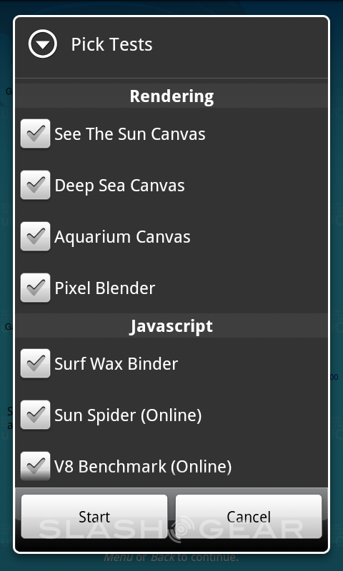 What this system aims to do is test out developers chops, mostly from a manufacturer standpoint, and see that they can perform well in a series of tests that see CPU and memory, Javascript, HTML5, canvas rendering speed, scrolling, network access, and more. When you run this benchmark suite, you'll be able to choose from amongst the handful of test you want to perform, be they in Rendering, Javascript, User Experience, Networking, or "Advanced." Each of these categories can be found in a section of the app called Pick Tests. And pick them you shall, for this test not only has the ability to show you your final cumulative score, it can give you the results of each individual test separately, all in a series of quite simple and well-designed screens. Well played!