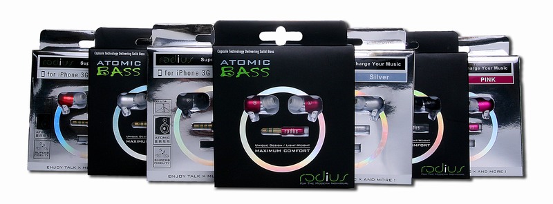 Radius Products have announced an updated range of their Atomic Bass Earphones, complete with redesigned cables, improved aluminum casings and better fit for wearers with smaller ears. The Radius Atomic Bass range includes standard stereo headphones and the company's "for iPhone 3G" version which incorporates a microphone and remote control.
