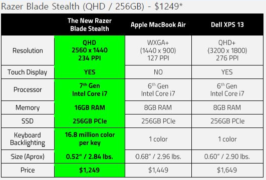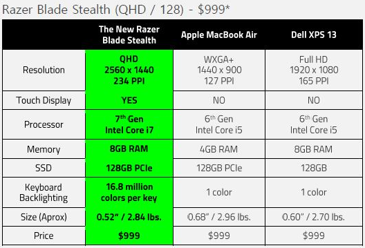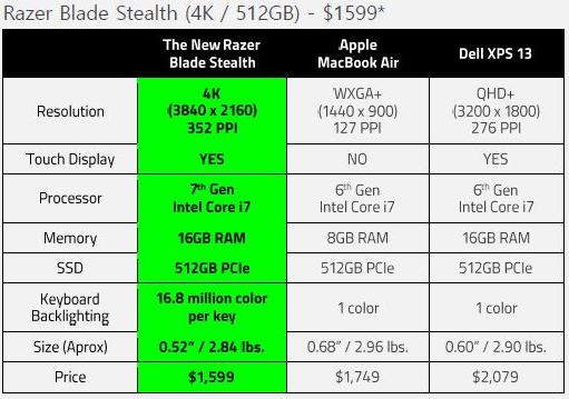 Above are charts provided by Razer showing three configurations for the Razer Blade Stealth. It's actually available in five different configurations in all. The least expensive version of the notebook with 4K display is in the gallery above, as are the two least expensive versions with WXGA+ (1440 x 900 pixel).