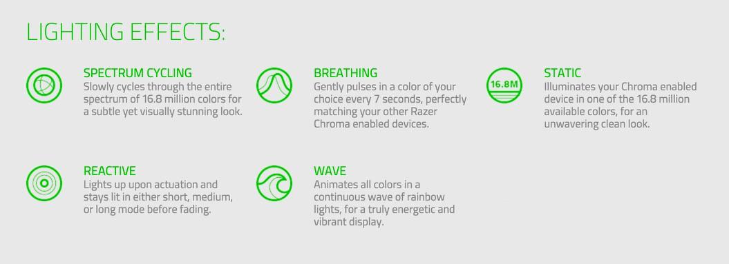 In the past this mouse came in a variety of colors. The first one glowed, the second version (in 2005) came in blue, green, and red, the 2007 edition had the first flat-black top with similar lights underneath. This 2015 edition with Chroma backlighting brings on the full spectrum of colors (16.8 million tones) offered with the rest of the Chroma line – so it's whatever color you want – and rolls with light across its scroll wheel and the Razer logo on its rear end.
