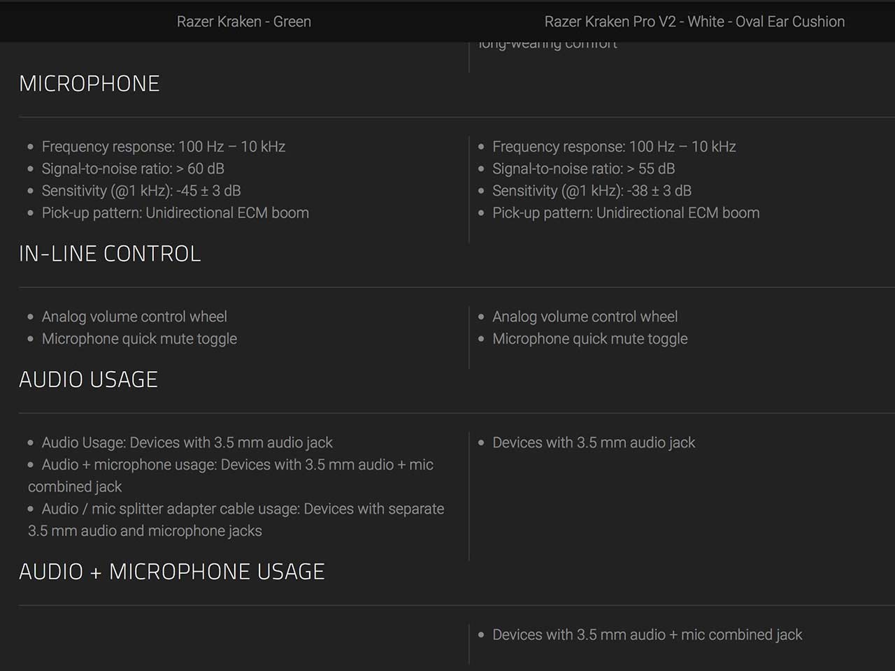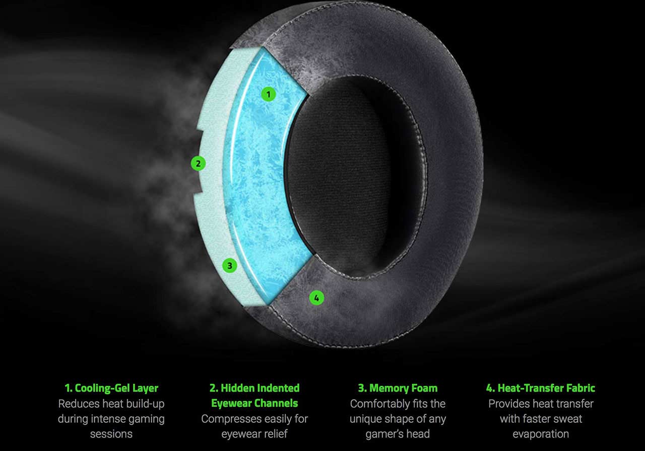 Ear cushions are made to cover and/or surround the entire ear with Razer's "cooling gel" made for long-term use. Inner cup diameter on these headphones is 54 mm x 65 mm, and cable length is 1.3 m / 4.27 ft. The weight of the headset is 322 g / 0.71 lbs, and two different ways to use the device are available.