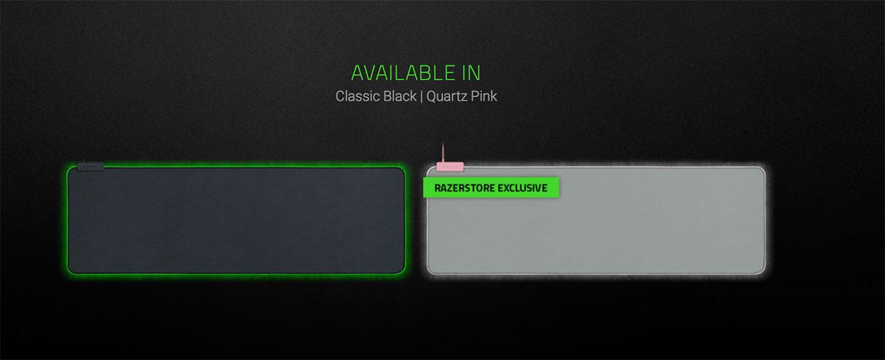 The least pink device in the collection is the Razer Goliathus Extended Chroma Quartz Pink. The entire pad is gray save the cord and the tiny rectangle where the cord hits the pad. Then there's a whole lot of color under the base, Chroma style, as well.