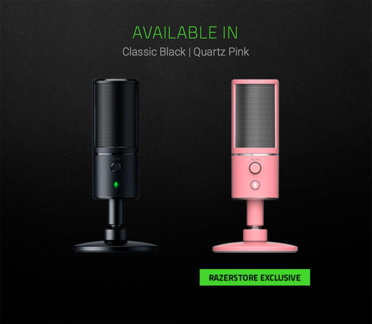 The Razer Kraken Quarz Pink edition has gray earpads and a gray arm for its pull-out and adjustable microphone. The Razer Base Station Chroma Quarz Pink is all pink – including its cord – but has all the colors in the Chroma universe under its base. Razer Seiren X Quartz Pink is all pink save its silver center band and the microphone grille.